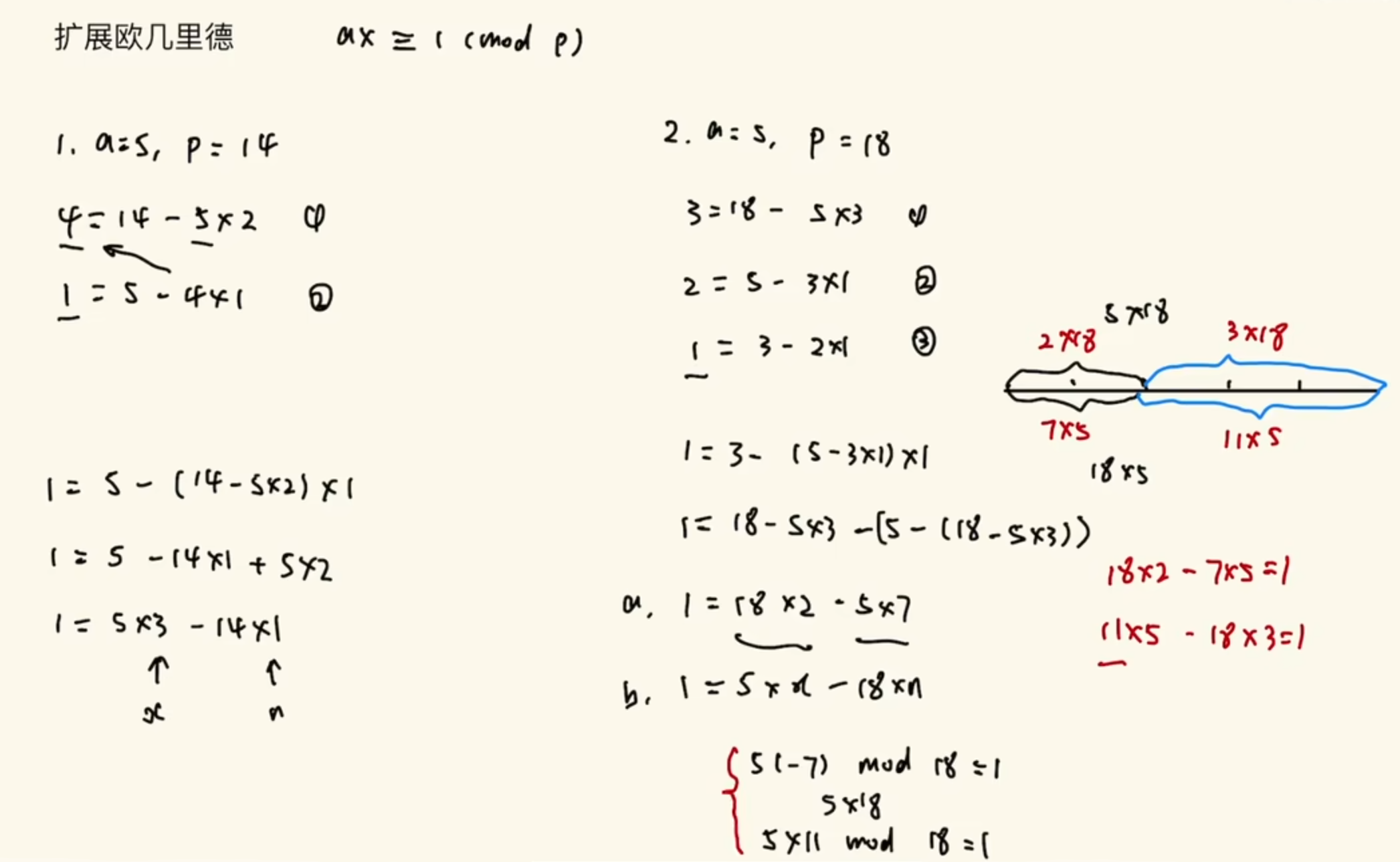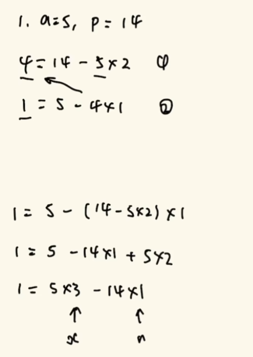 - 如此得到最终式子后,再使用上面的式子进行代换,即: 1 = 5 - 4×1 = 5 - (14 - 5×2) = 5×3 - 14,故 5 的逆元为 3