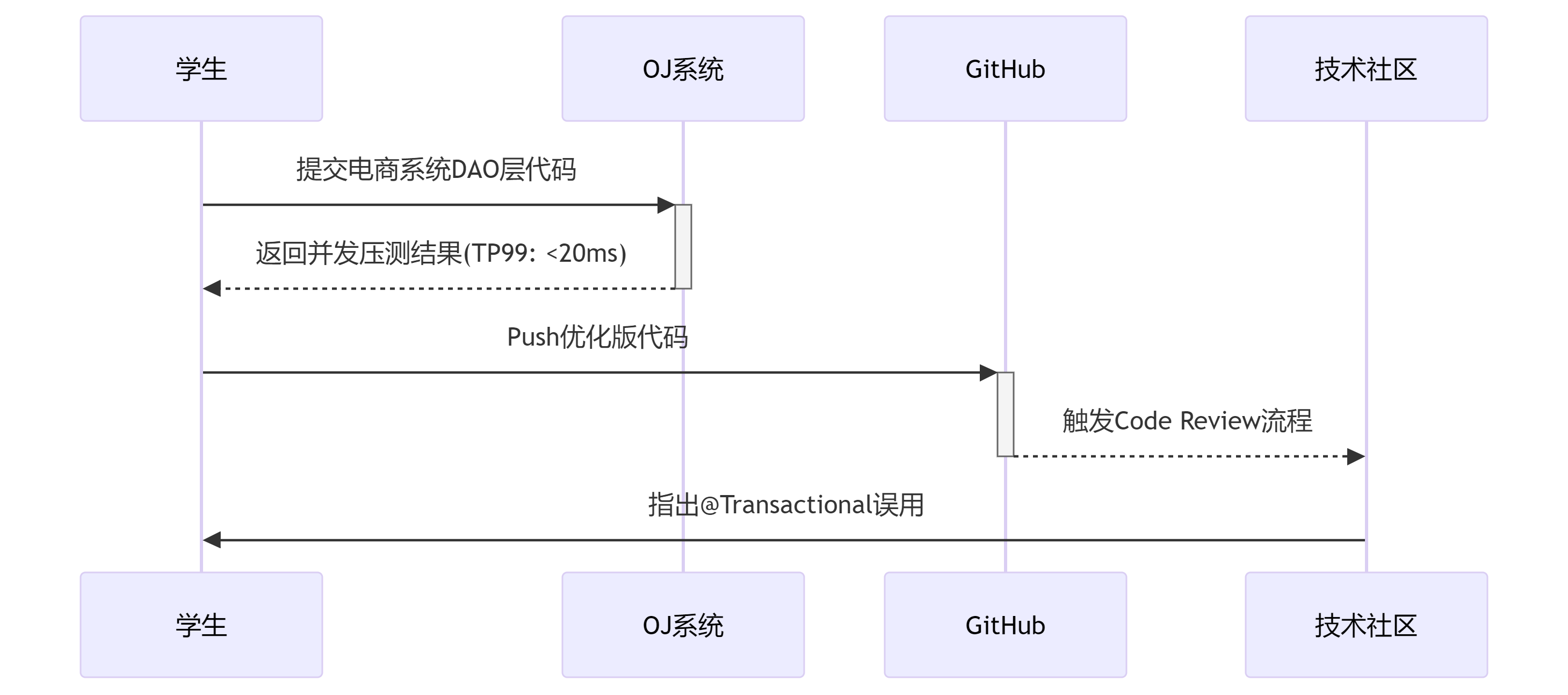 mermaidsequenceDiagram 学生->>+OJ系统: 提交电商系统DAO层代码 OJ系统-->>-学生: 返回并发压测结果(TP99: <20ms) 学生->>+GitHub: Push优化版代码 GitHub-->>-技术社区: 触发Code Review流程 技术社区->>学生: 指出@Transactional误用