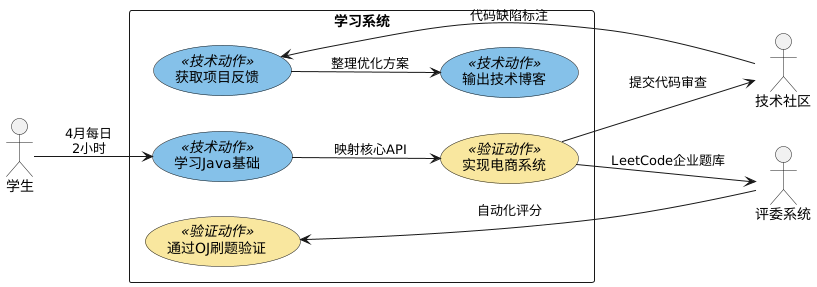 mermaidsequenceDiagram 学生->>+OJ系统: 提交电商系统DAO层代码 OJ系统-->>-学生: 返回并发压测结果(TP99: <20ms) 学生->>+GitHub: Push优化版代码 GitHub-->>-技术社区: 触发Code Review流程 技术社区->>学生: 指出@Transactional误用能力转化路径