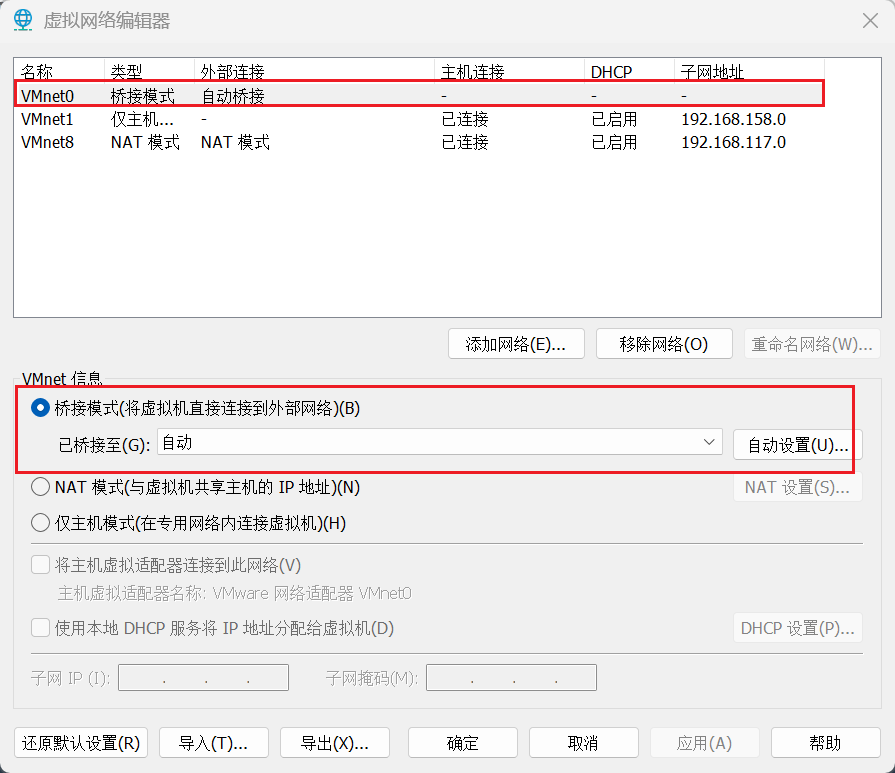 1、编辑 -- 虚拟网络编辑器中 --(VMnet0、 VMnet1、 Vmnet8)