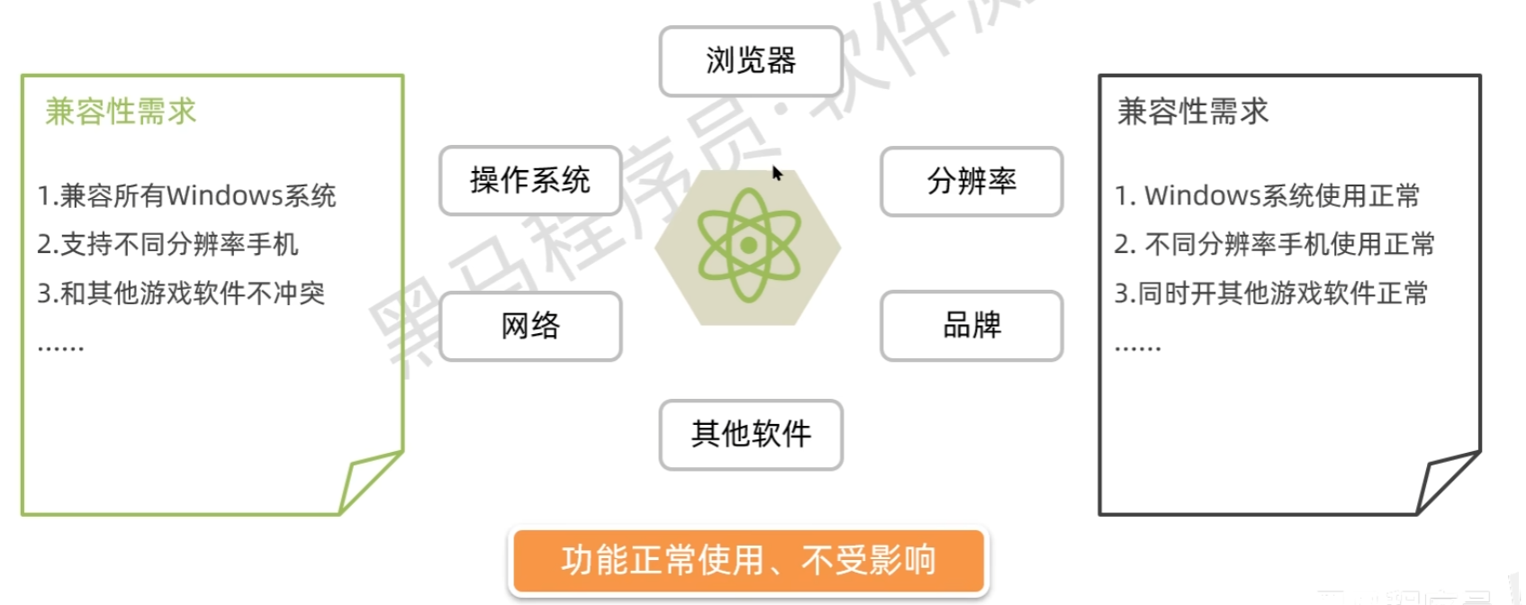 - 说明:软件在不同环境中运行的能力,包括与其他软件、硬件、操作系统和网络环境的兼容。