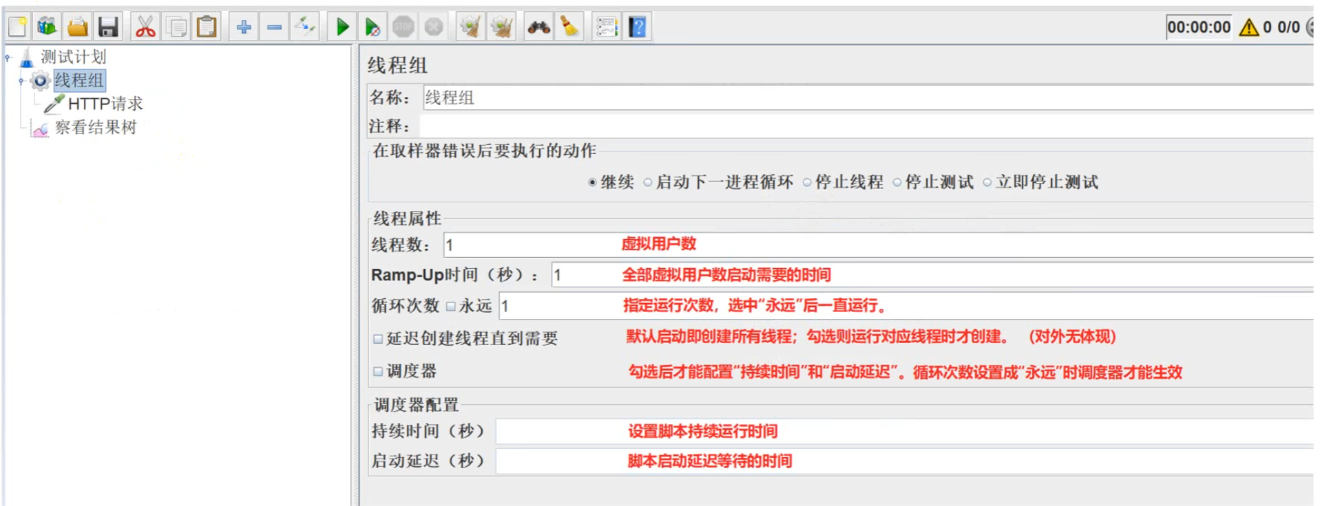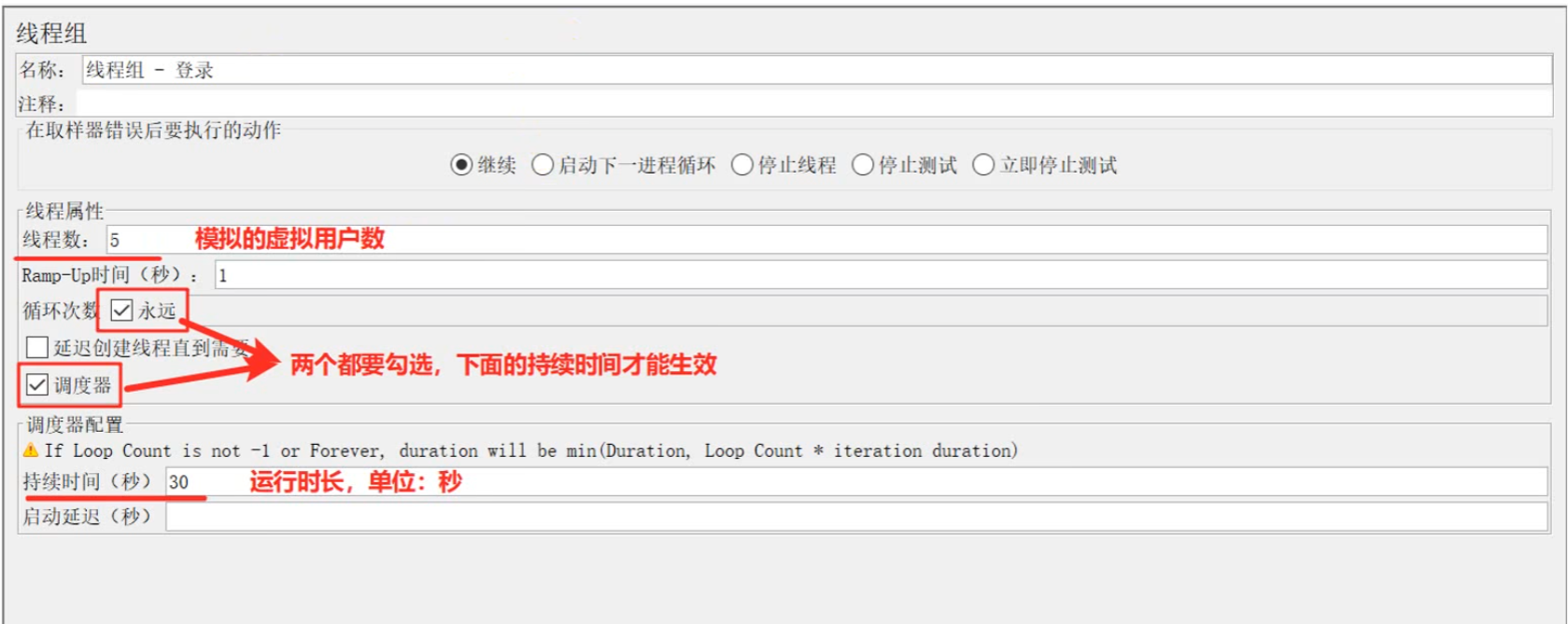 - 调度器:可以设置持续时间、启动延迟等参数,若勾选了调度器,并规定持续时间,则线程组会一直运行直到调度器设定的持续时间结束