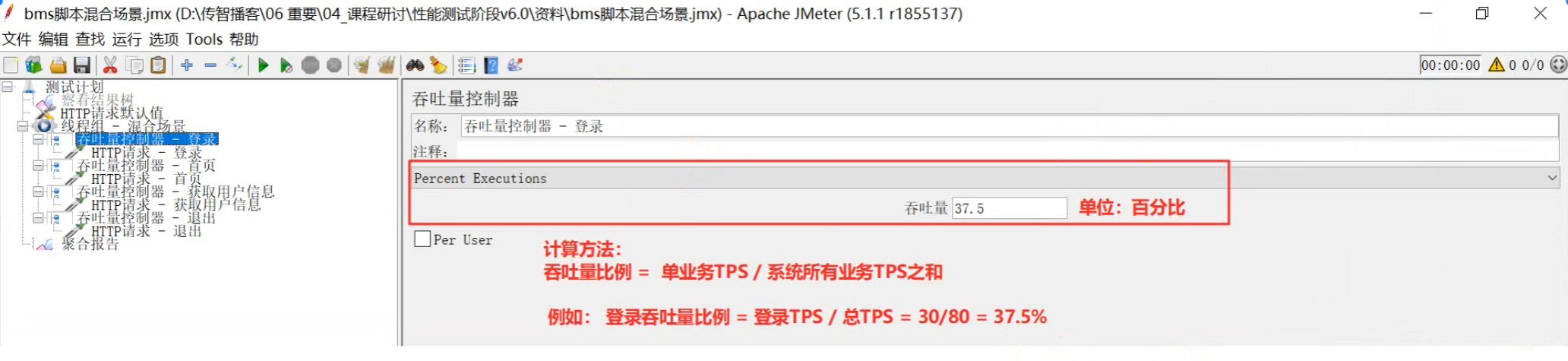 - 添加吞吐量控制器和HTTP请求,设置吞吐量比例