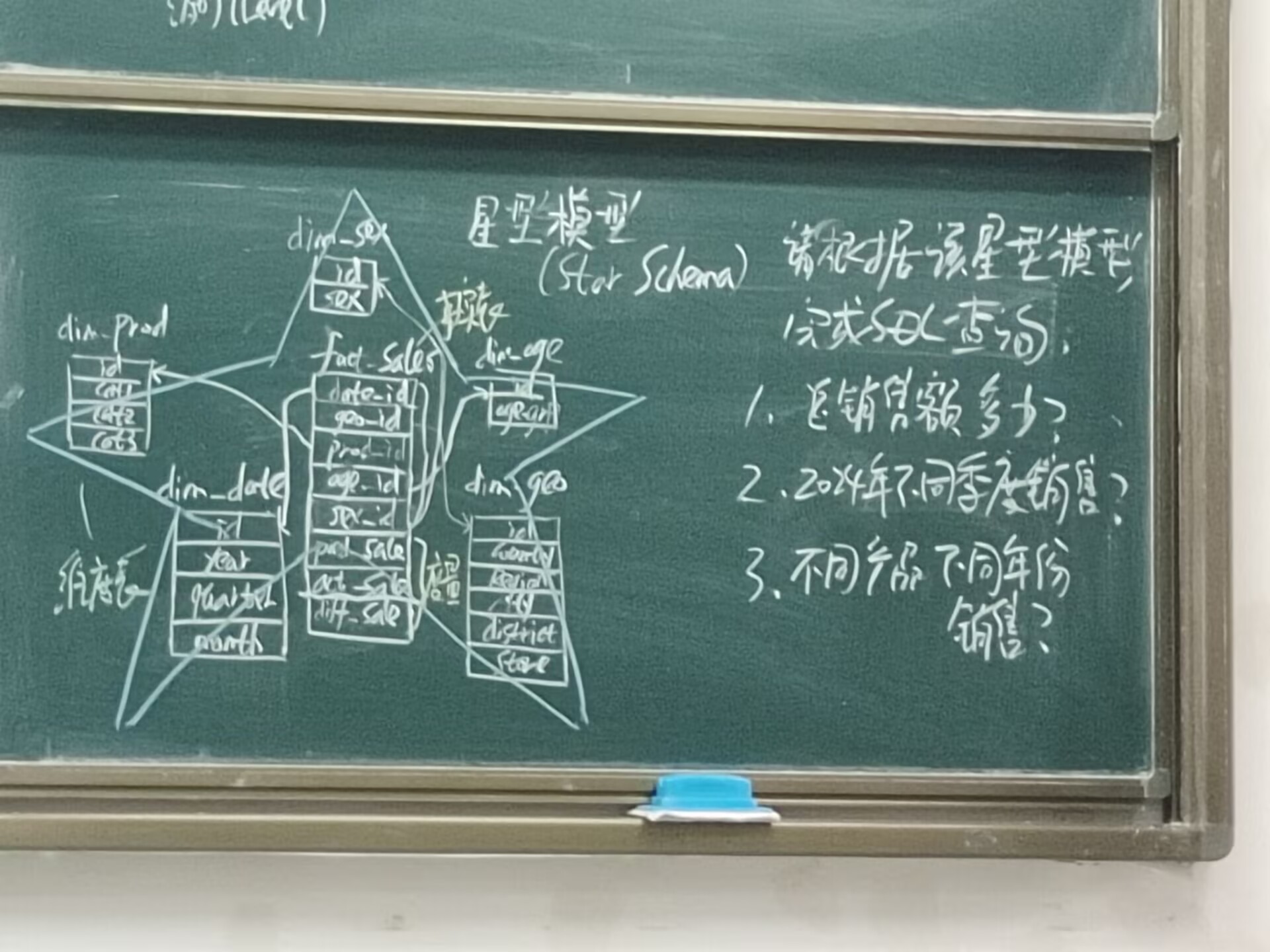 基于星型模型示例中的表结构,我来编写 SQL 查询语句来解决给定的三个问题。