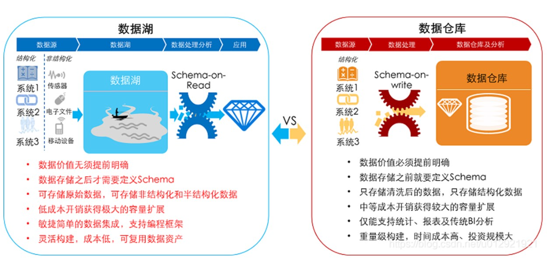• 数据湖是与数据仓库相对的概念。数据仓库有两个局限:一是只可以回答预先设定的问题,二是数据已经被筛选包装好,无法看见其最初状态