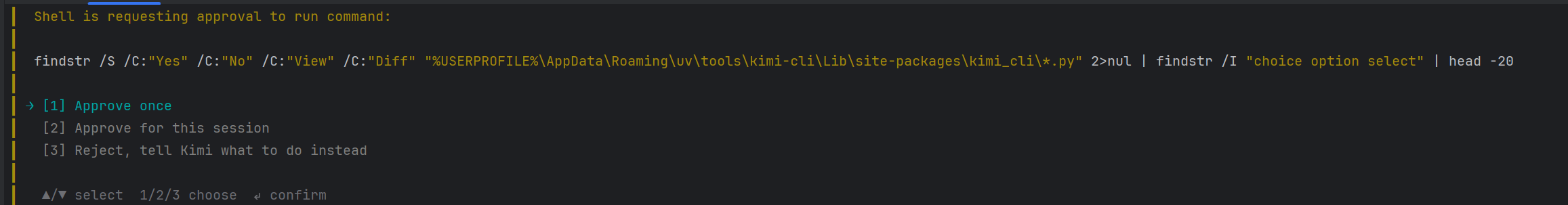 | [2] Approve for this session | 批准本次对话期间的所有命令,直到关闭 Kimi CLI | 信任当前任务,让 AI 连续执行多个操作(如批量修改文件) |