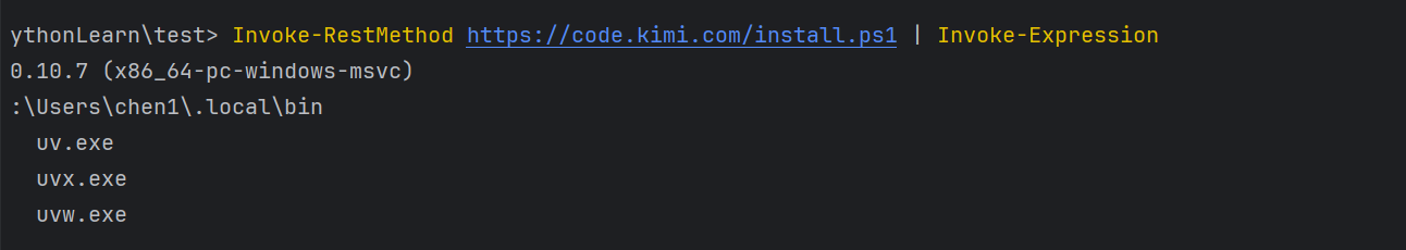 uv tool install --python 3.13 kimi-cli --native-tls,若下载成功,则说明临时添加path成功,需要再在终端输入命令将path进行永久配置:[Environment]::SetEnvironmentVariable("Path", "C:\Users\chen1\.local\bin;$([Environment]::GetEnvironmentVariable("Path", "User"))", "User")