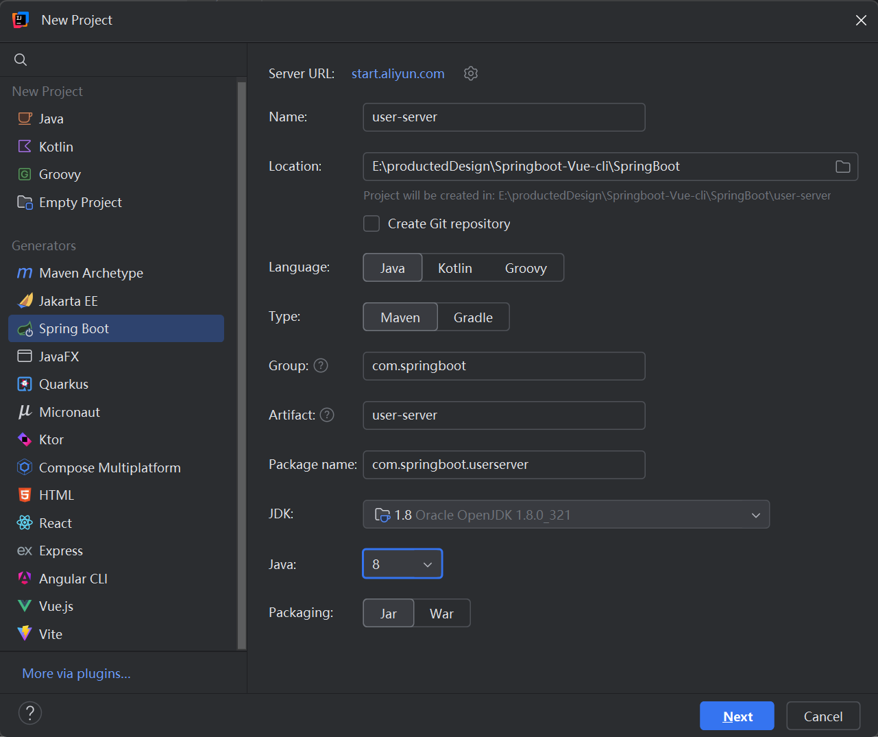 Group填写是域名的倒置写法,项目存储地址Location不要有中文路径(可能会有乱码),Artifact与Name相同,Package-name是代码的根目录,所有代码都放在该位置下 Java版本需要在Java17版本以下(不包括Java17),因为17以后的版本使用SpringBoot3.0, Packaging是打包方式,选择为war包,则打包后还需要安装tomcat服务器并解压到该服务器中运行;而选择打包为jar包,其有内嵌的tomcat服务器,所以只要直接启动jar包即可