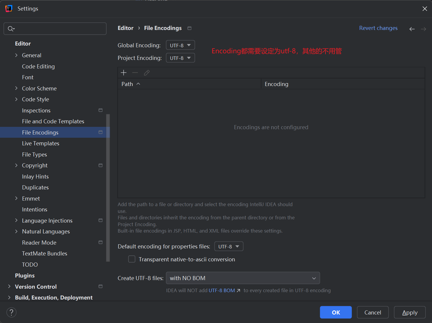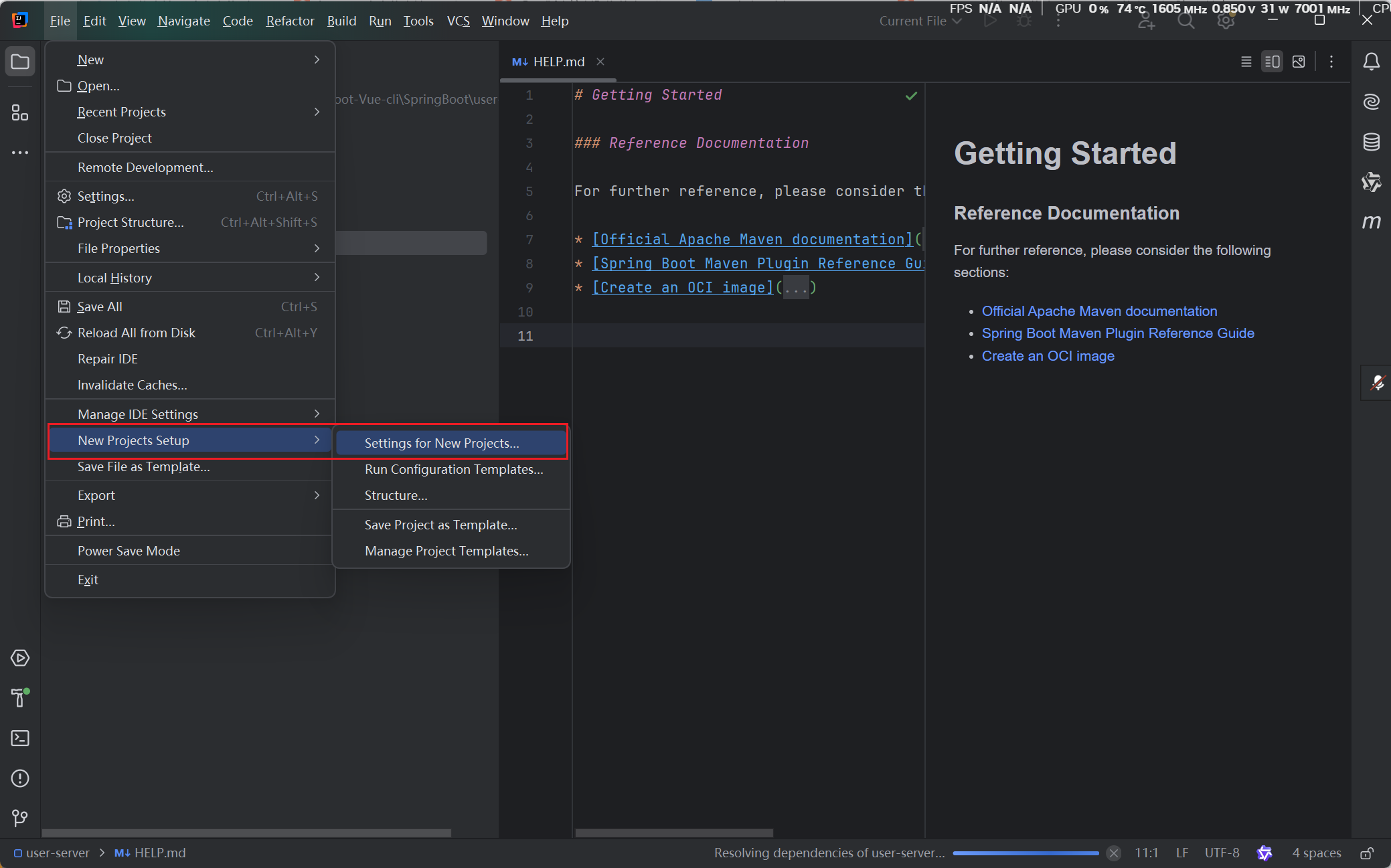 随后对该New Project Setup中的Settings for New Projects的设置也同上settings设置一样修改,这里就不再贴图展示,上述修改是仅对刚刚创建的user-server项目生效的设置,而现在设置的是对以后所有新建立项目的设置,这样以后新建项目就不用每次都进行设置了