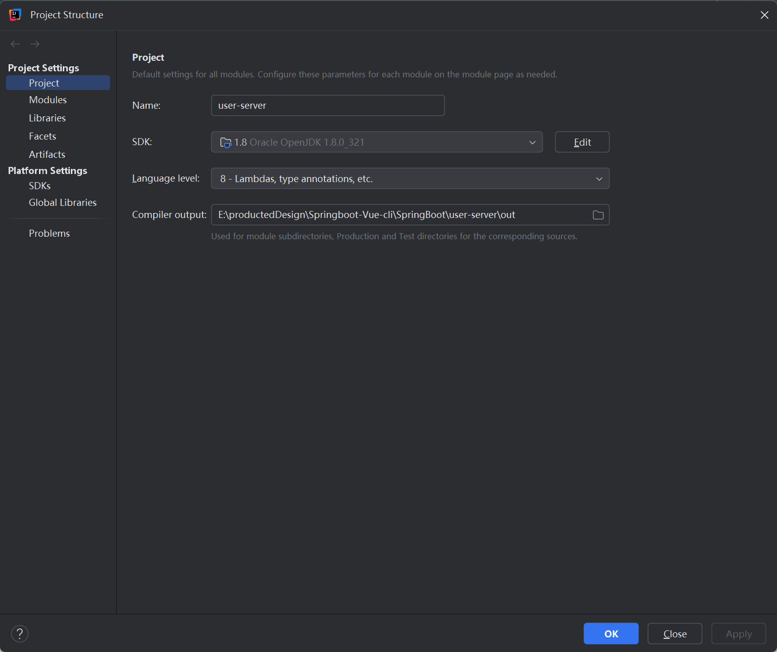 - 设置对应SDK,Language level需要选择对应版本,不确定则选择SDK DEFAULT,系统会自动匹配