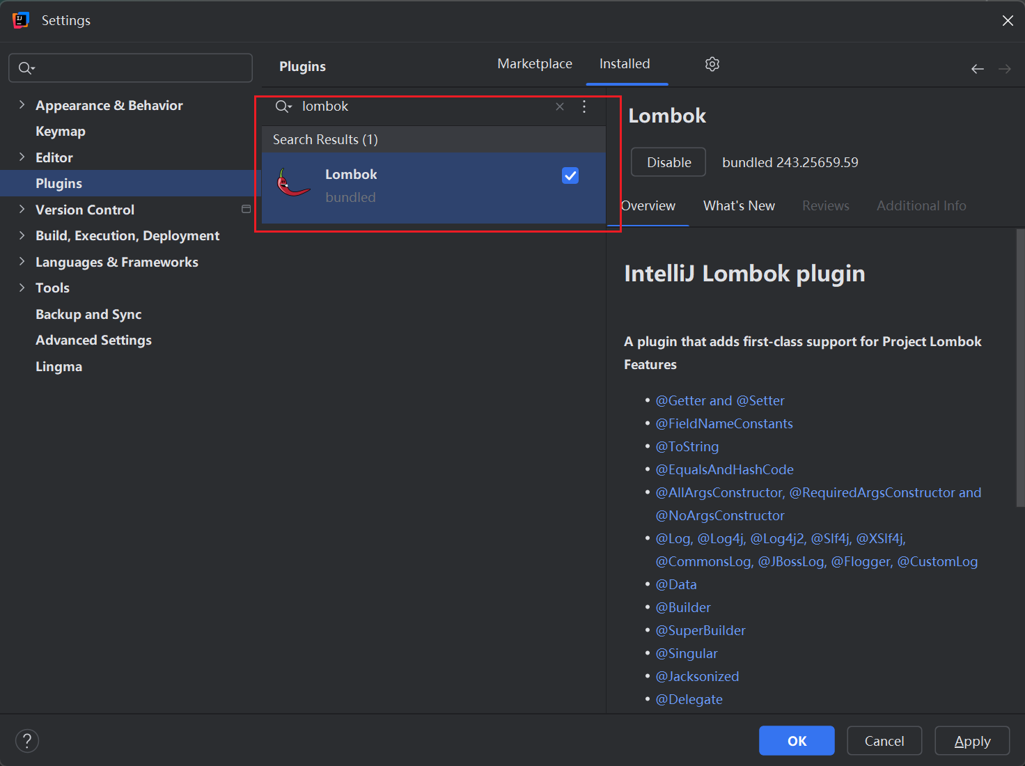 - 最后在Setting中,找到plugins设置,下载lombok插件