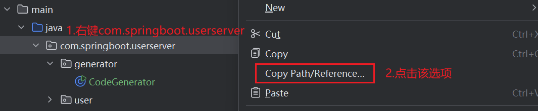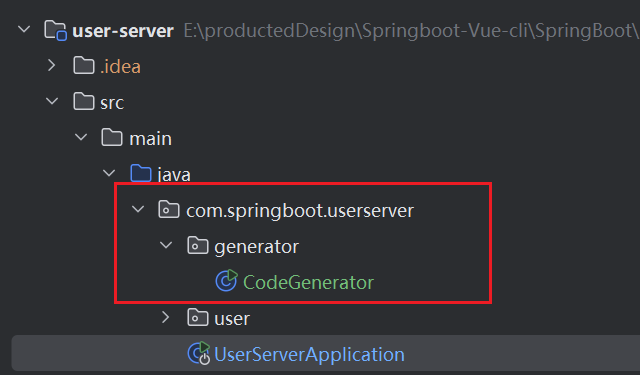- 将老师给的CodeGenerator.java代码复制到com.springboot.userserver.generator包下,随后更改第26行
