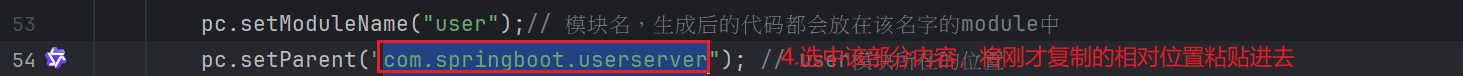 pc.setParent("com.springboot.userserver"); // user模块所在的位置
