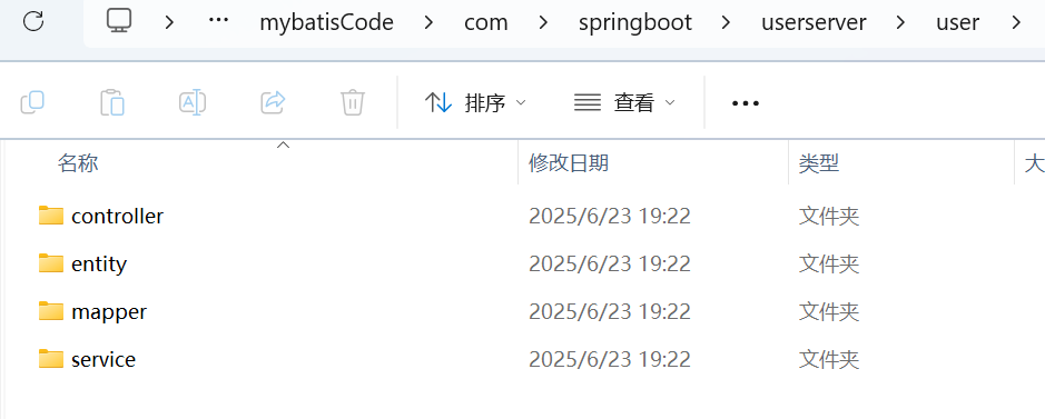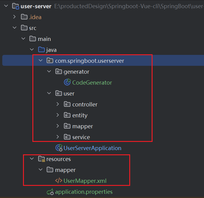- 执行该代码生成器,随后到指定位置(第一步中设置的生成代码存储地址:D://mybatisCode)中查找对应代码,将D:\mybatisCode\com\springboot\userserver\user⽂件夹粘贴到com.springboot.userserver包下,再在resources下创建mapper包,将D:\mybatisCode\src\main\resources\mapper\user\UserMapper.xml文件粘贴到该包下