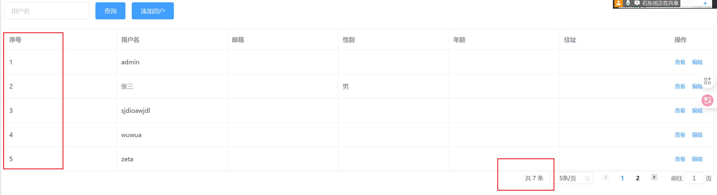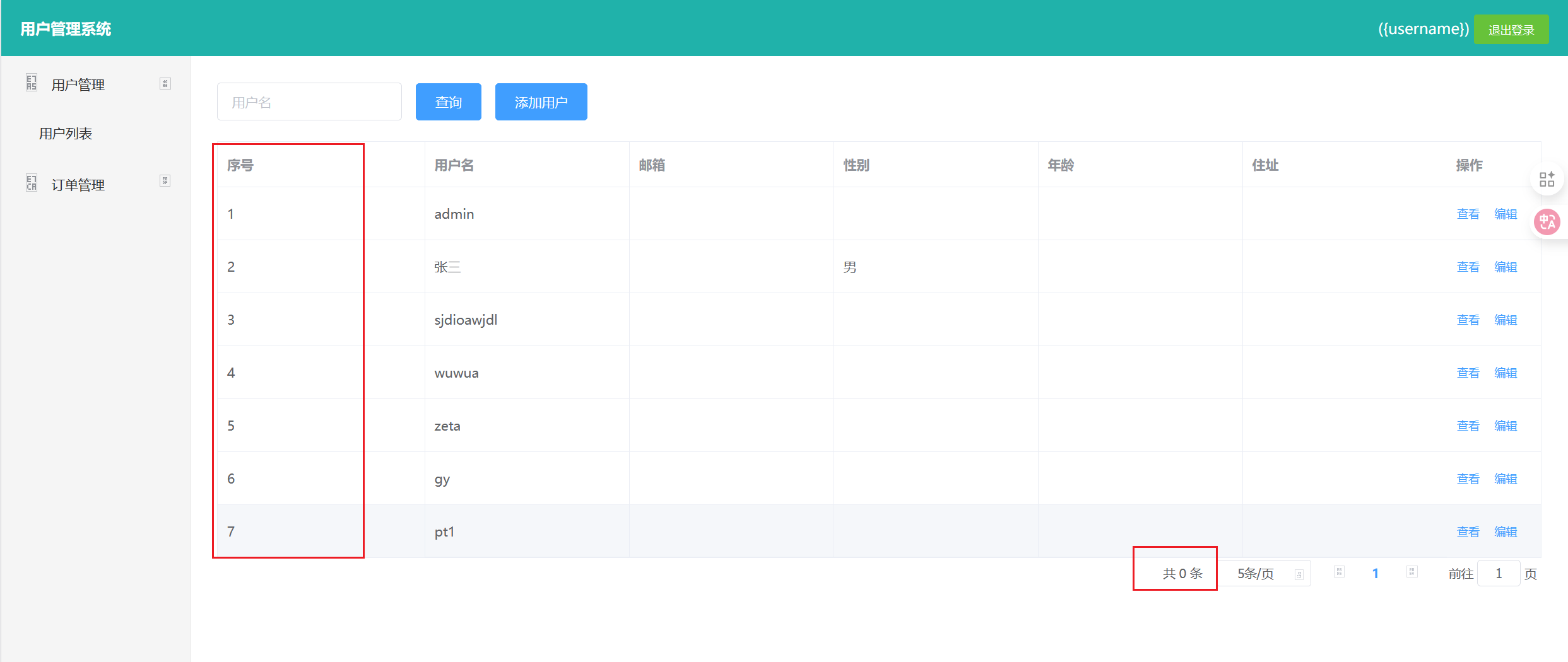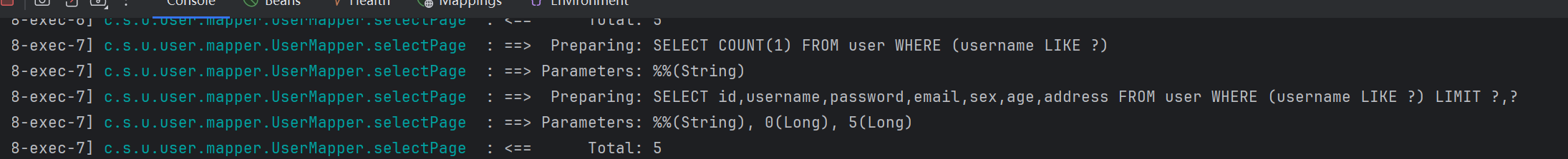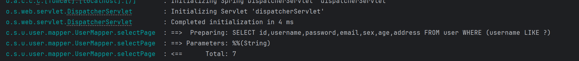 点开用户列表后发现,所有七个用户的信息都展示出来了,但我们先前在前端设定的每页最大数量pageSize为5,pageNumber页码则是目前所在的页码值,但这里显示错误,我们前往后台查看终端显示
