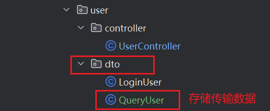 - controller层将请求转发给service层处理,就需要在/service/UserService中进行方法声明,并在/service/impl/UserServiceImpl中对该方法进行实现,但在那之前,我们还需要一个存储数据的对象场景,即在dto(数据传输对象)下新建QueryUser.java文件,将数据存储在该对象中