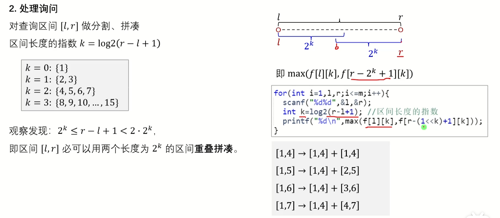 int k = log2(r-l+1); // log2函数在cmath库中,且返回的是对应的浮点数类型,将其赋值给int,只取整数部分