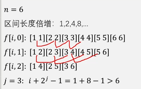 for (int i = 1; i + (1 << j) - 1 <= n; i ++) // 枚举小区间起点,合并后的大区间必须要 <= n