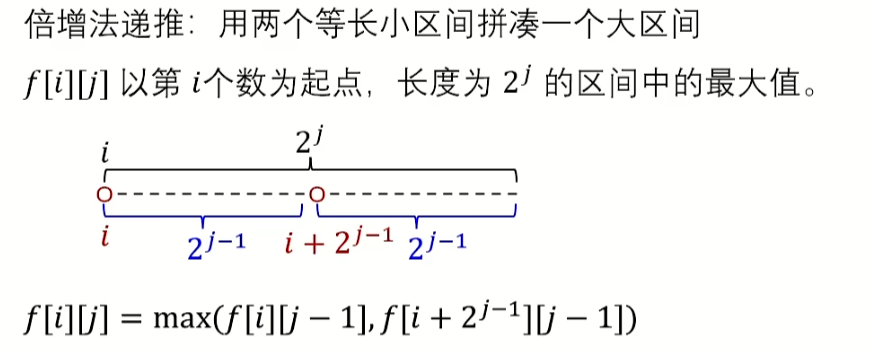 f[i][j] = max(f[i][j - 1], f[i + (1 << (j - 1))][j - 1]); // 求最大值(两个小区间的最大值中更大的那个数)