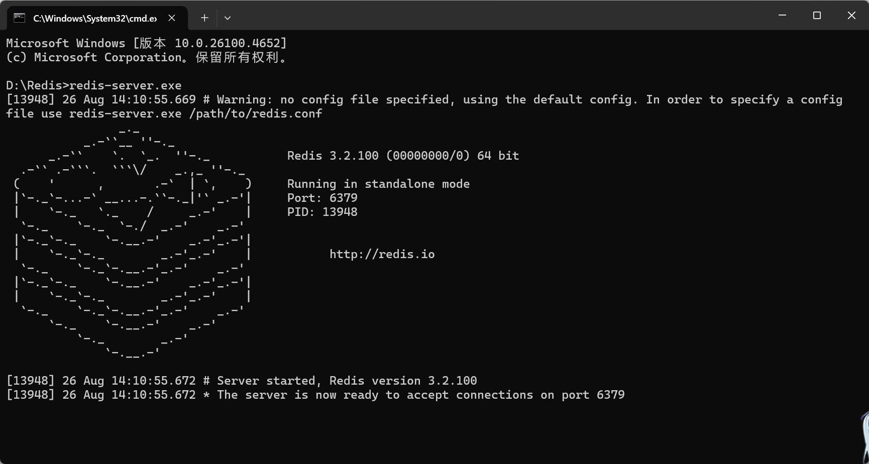 - 若未设置环境变量,则需在redis文件夹下打开cmd,并输入命令行redis-server.exe启动redis,启动后不要关闭该命令框