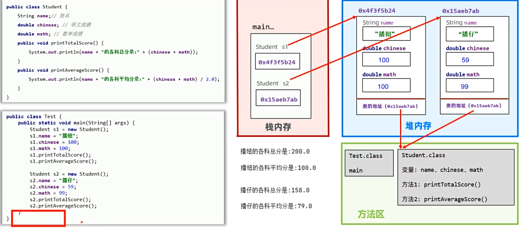 首先,创建完学生类和main类后,将会在方法区创建Test.class和Student.class的空间,并包含有其变量方法等内容; 随后,在main中创建类,会先将main压入栈内存并分配一部分空间,还会在堆内存处分配一块内存空间(有其自己的对象和属性),然后会在栈内存中的main空间处创建Student s1对象,并根据从堆内存中获取的地址赋给s1,使得对对象s1进行操作修改时,就会找到其对应地址处,并将数据赋值给对应的变量,若调用方法,则会到对应对象中,然后找到该对象的类的地址,再从该类的地址处找到方法,然后将对应方法调入栈内存,用完后清除出栈,空出空间。