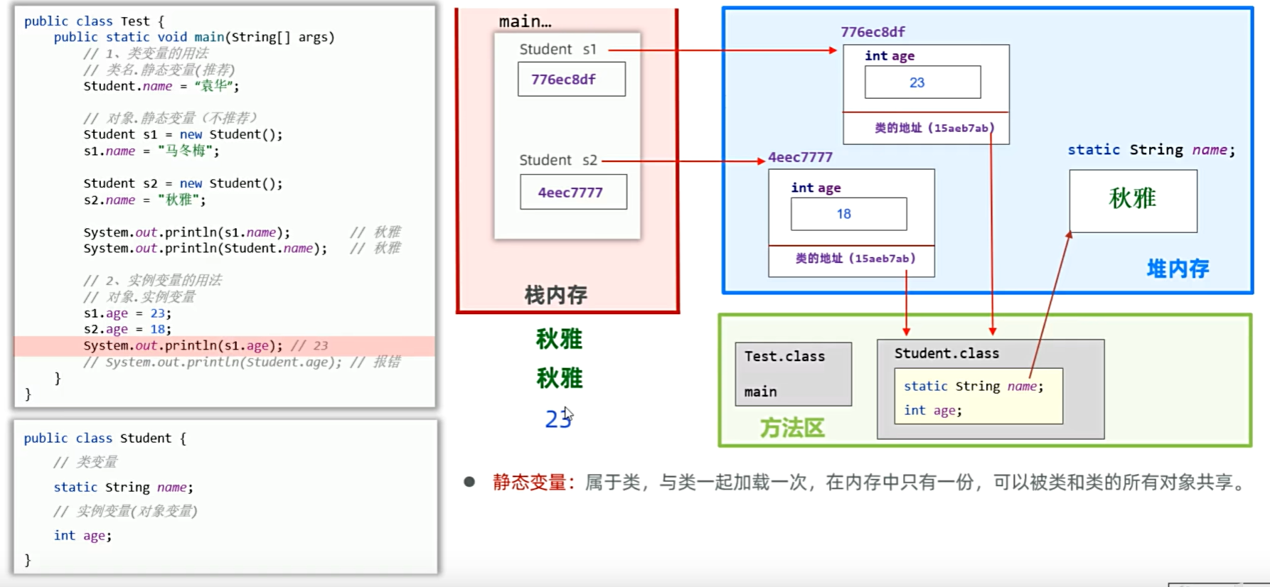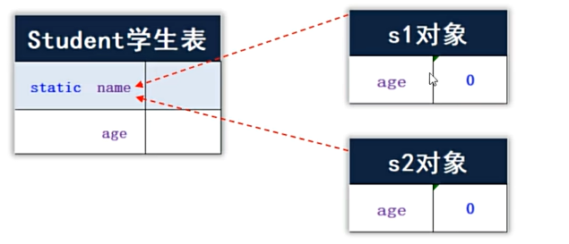 ,当创建s1、s2对象时,会为每一个对象新建一个age,该age实例变量属于对应的对象,而name是属于类的,被对象s1和s2共享使用