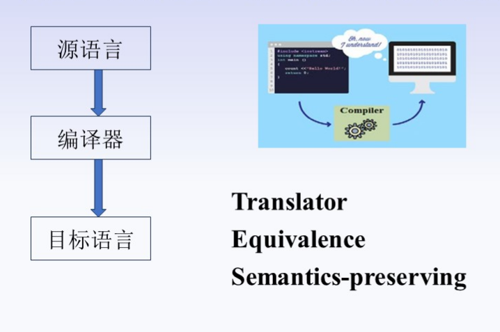 - 概念:将一种语言(源语言)编写的程序,翻译 成等价的、用另一种语言目标语言)编写的程序