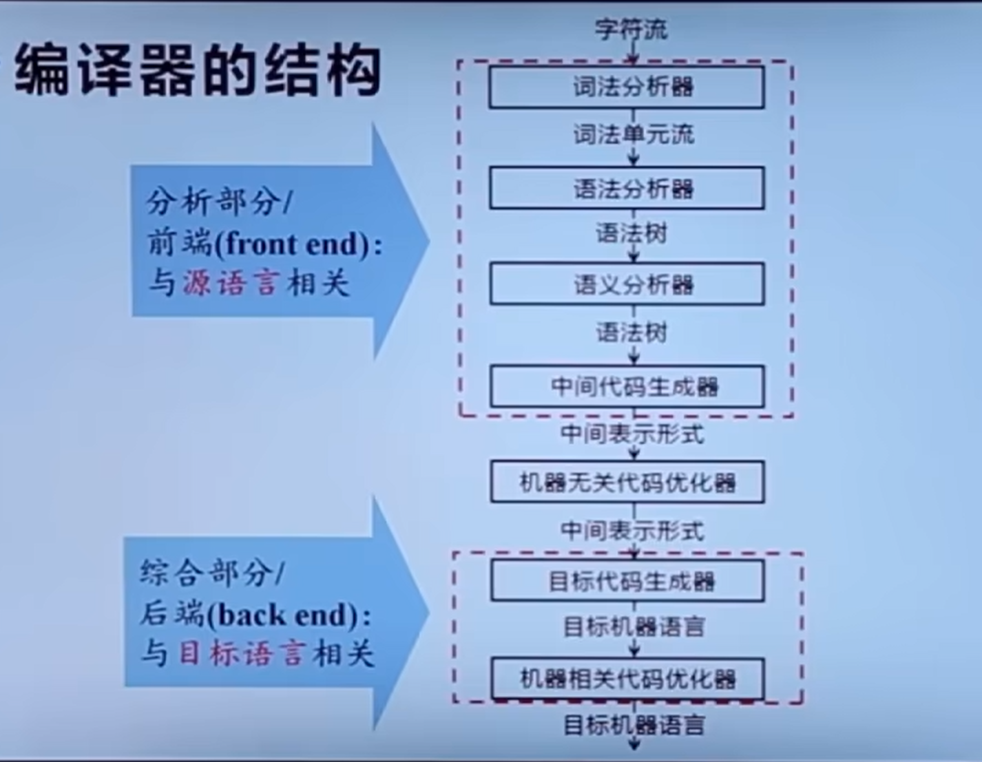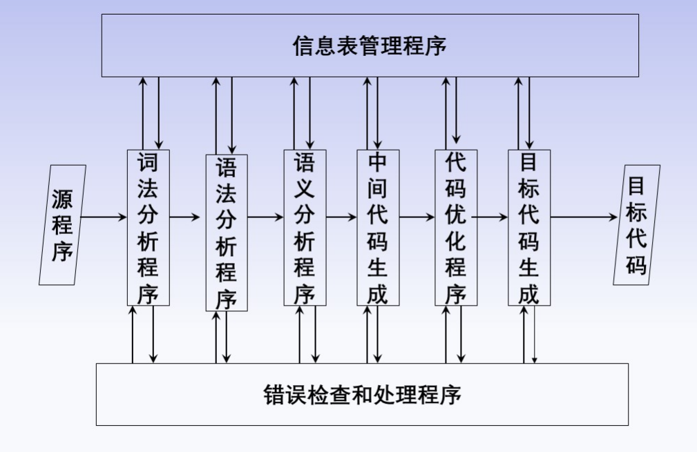 词法分析 --> 语法分析 --> 语义分析和中间代码生成 --> 代码优化 --> 产生目标代码 --> 表格处理及错误处理