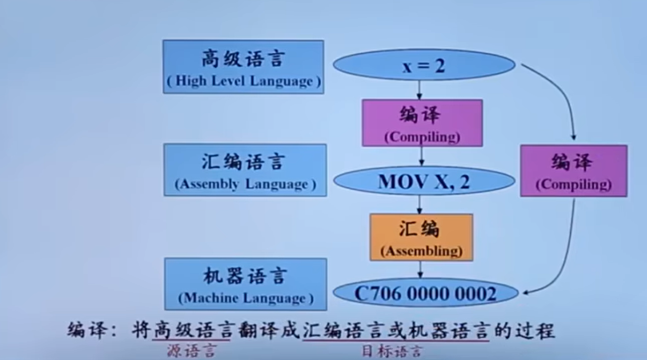 - 编译就是将高级语言(源语言)翻译成汇编语言或机器语言(目标语言)的过程