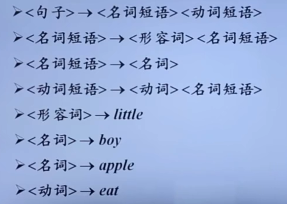 - 没有用尖括号括起来的部分称为语言的基本符号,如:little,boy等