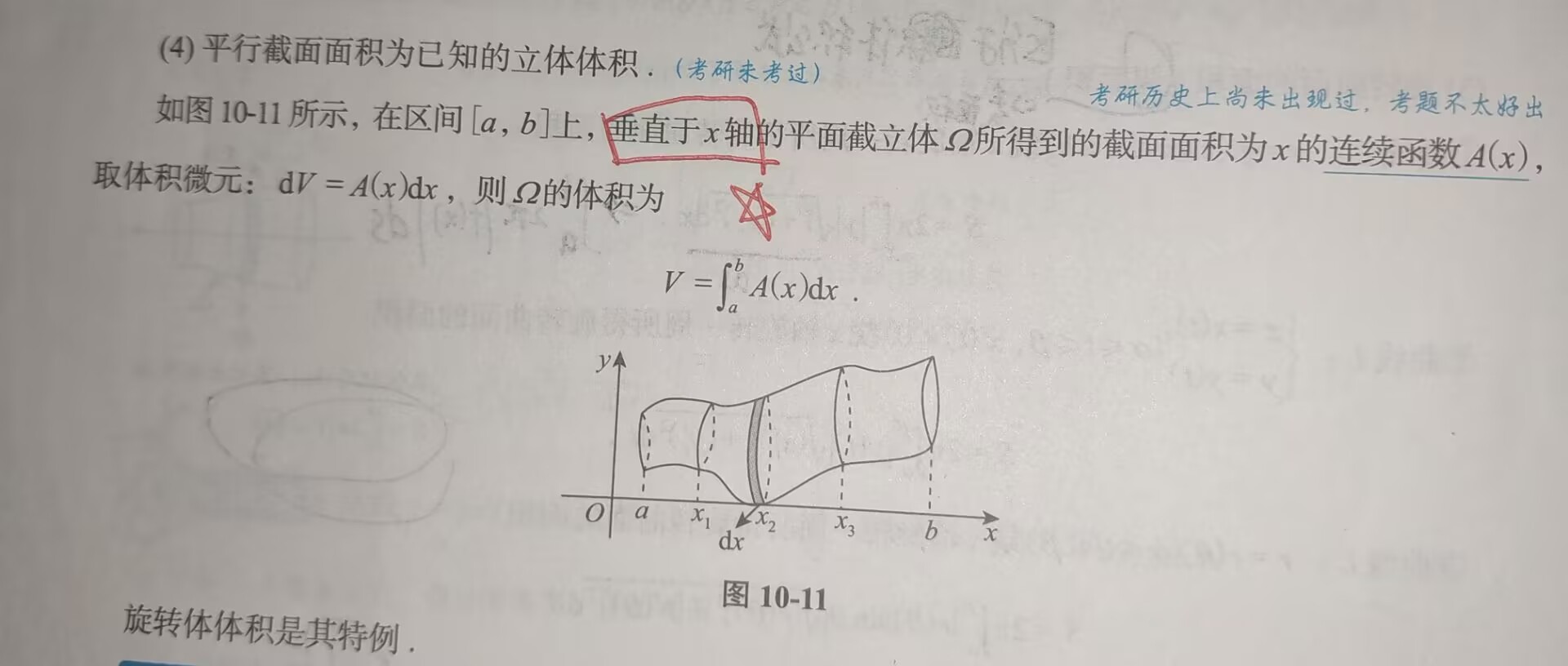 - 为什么说旋转体体积是其特例?因为该已知平行截面面积的立体体积,可看做是某一函数
