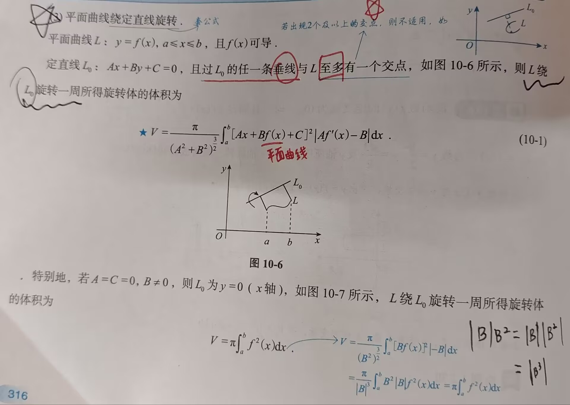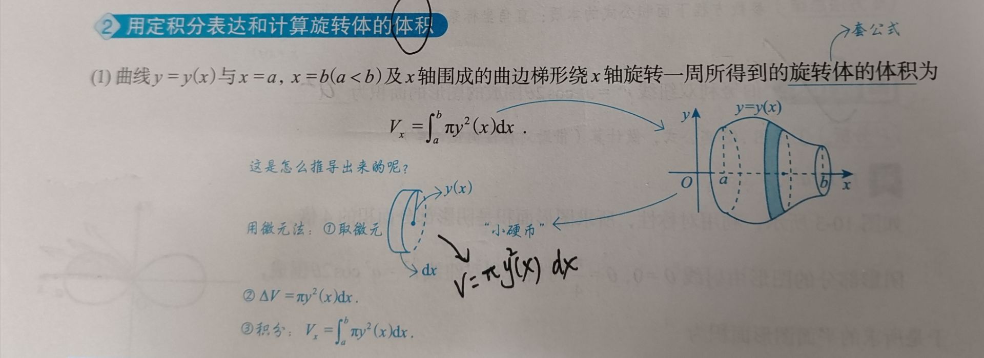 (将x ,y地位互换),再使用绕 y 轴旋转的体积公式(因为相当于将坐标轴旋转了,x 轴变到了原先 y 轴的位置,还要注意要将公式中的 x 换成 y, y(x) 换成 ) - 若要求该图形绕 y 轴旋转的体积,则同理,求出