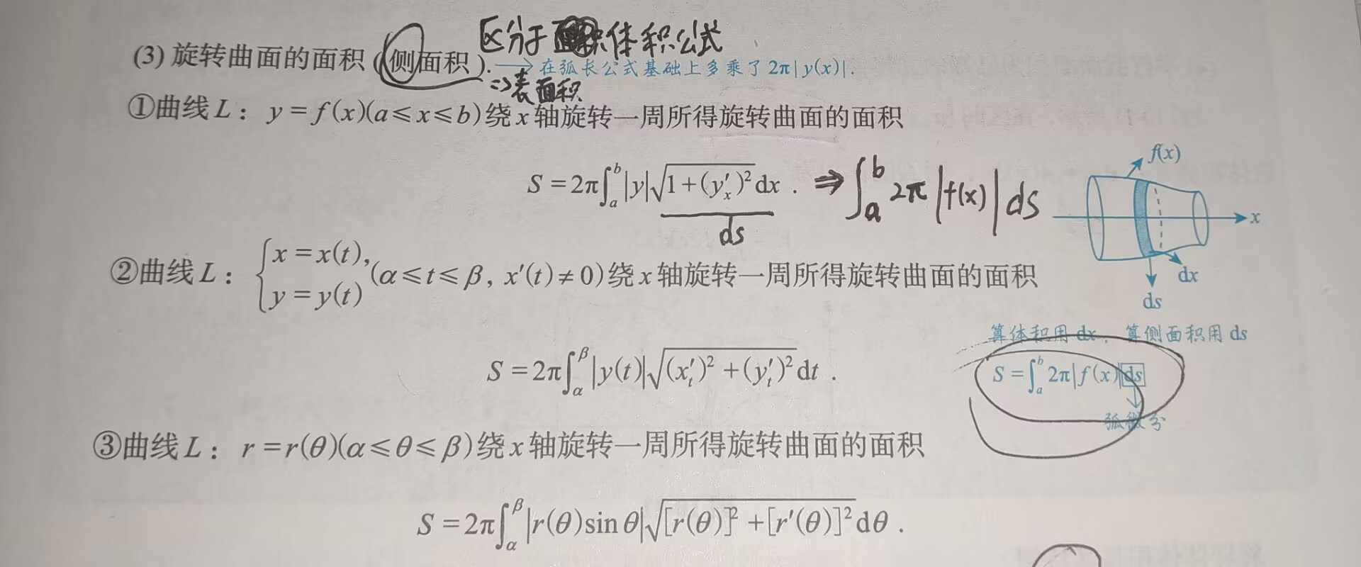 - 注意该侧面积求的是绕 x 轴旋转所得的旋转曲面面积
