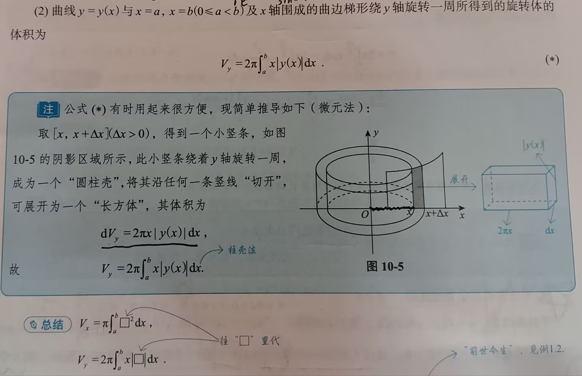 "柱壳法"求体积:将截取的一小块(阴影部分)绕 y 轴旋转,可得到一个小的空心圆柱,将其平摊展开,可近似得到右侧的长方体,长为