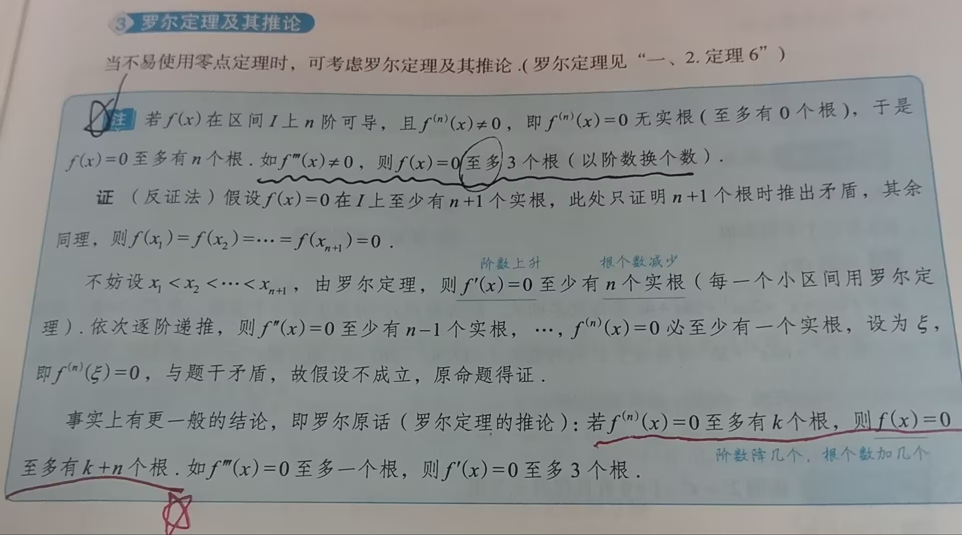 在区间 上 阶可导,且 ,即: 无实根(至多有0个根),于是 至多有 个根,如: ,则 至多有三个根(以阶数换个数) - 推论的证明如下: