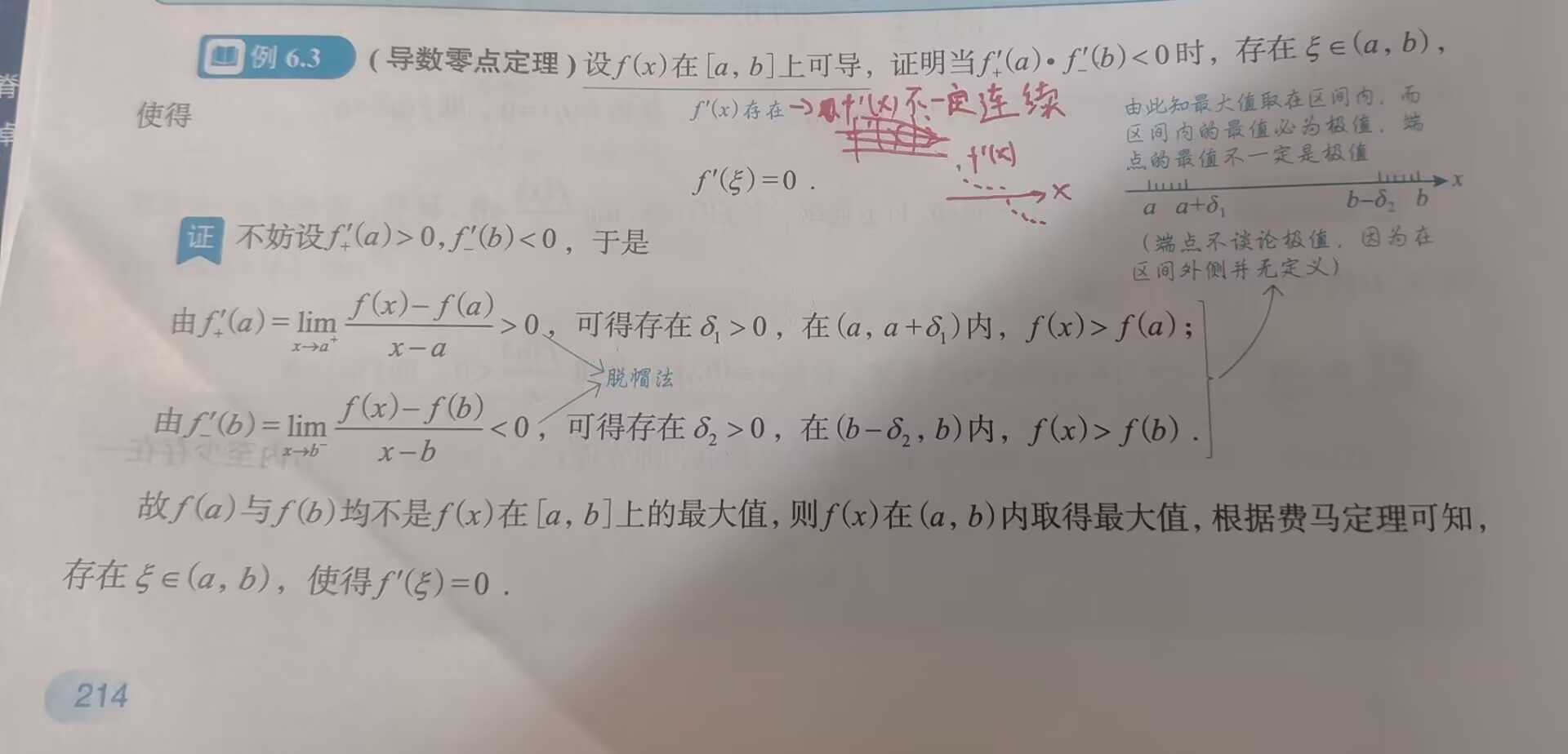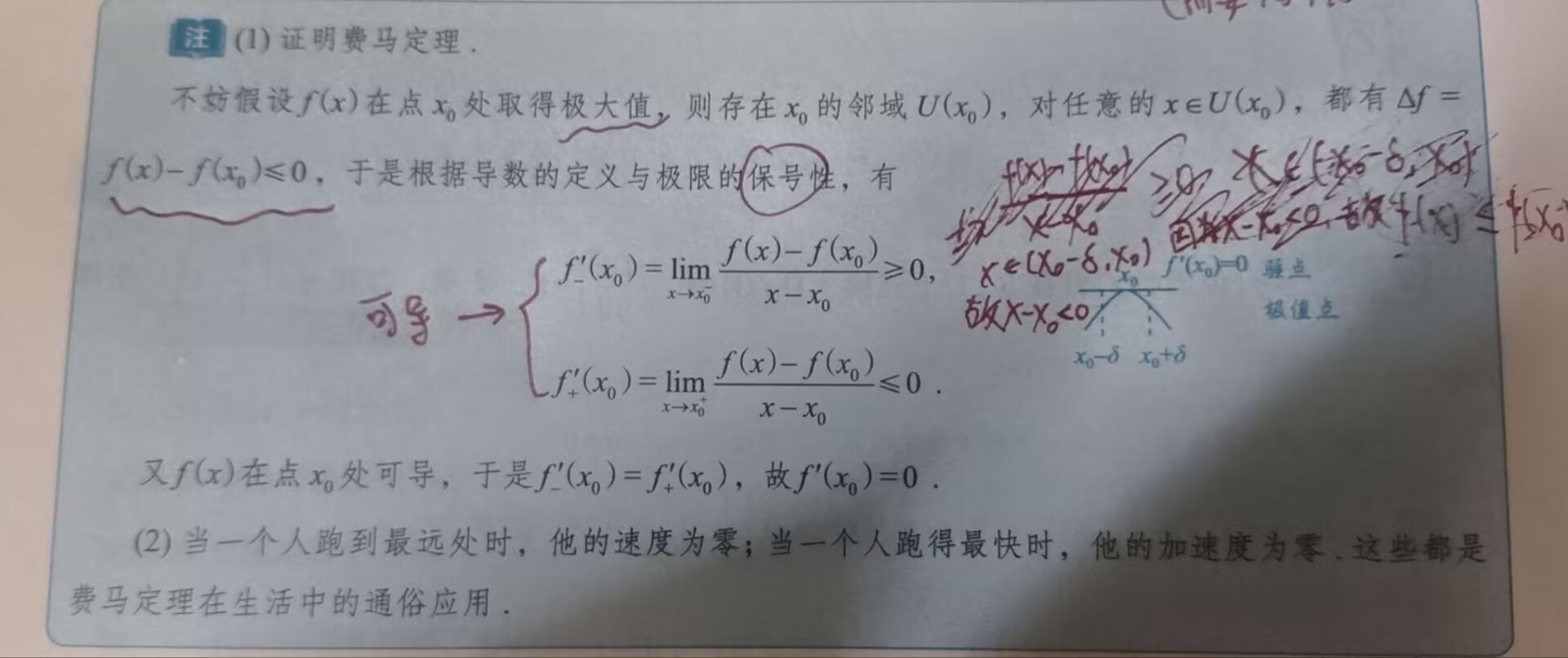 在点 处满足 1. 可导,2. 取极值,则- 需要注意的是,若函数仅在有限区间内可导,则要注意,此时函数在端点处取不到极值,因为极值存在需要在该点有左、右导数,