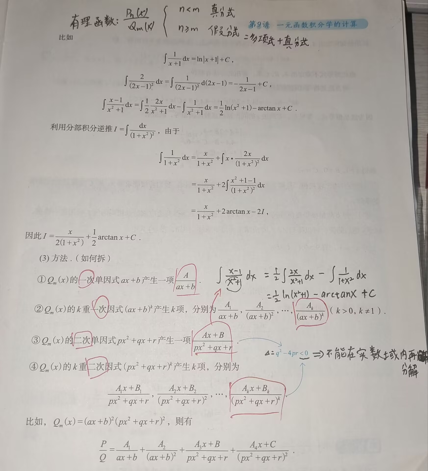 的积分称为有理函数的积分,其中 分别是 的 n 次多项式和 m 次多项式 时为真分式, 时为假分式