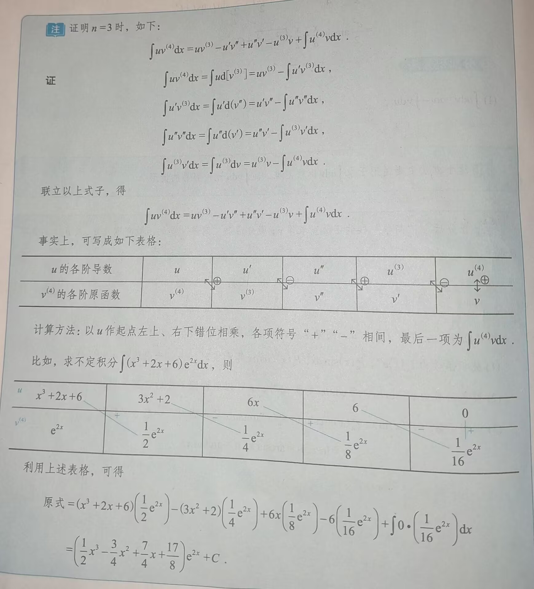 , , 设函数 与 具有直到第 n+1 阶的连续导数,并根据分部积分公式: ,则有: 辅助记忆:等式右边的各项正负交替出现,奇数项为正,偶数项为负(也可使用图中的表格法) 证明过程: