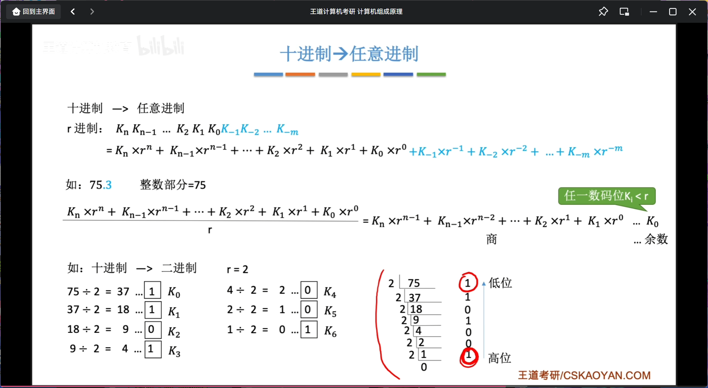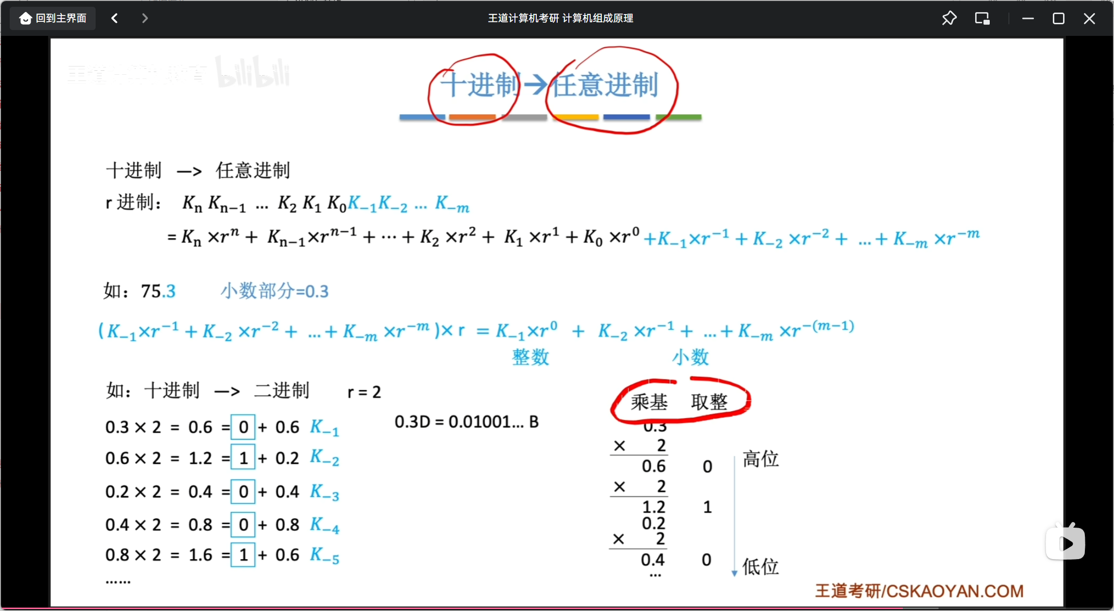 并不是每个十进制小数都可以准确地用二进制小数表示,例如:0.3 ---- 小数部分永远都得不到精确值,只能无限接近于要求的值,但任意一个二进制小数都可以用十进制小数表示,其他进制同理