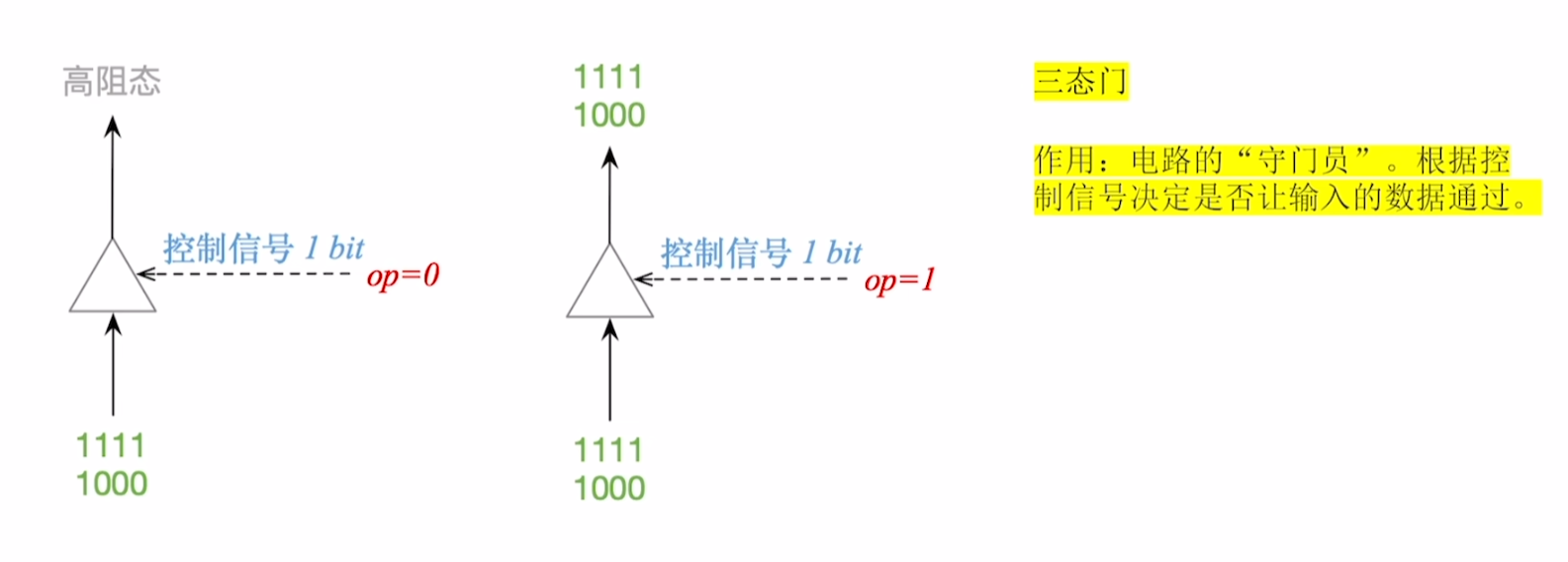 - 三态门只能决定是否让输入数据通过,若不让数据通过,则输出一个高阻态(若电路中使用0,1表示高低电平,高电平为5V,低电平为1V,则高阻态是0V,即不属于高电平也不属于低电平)