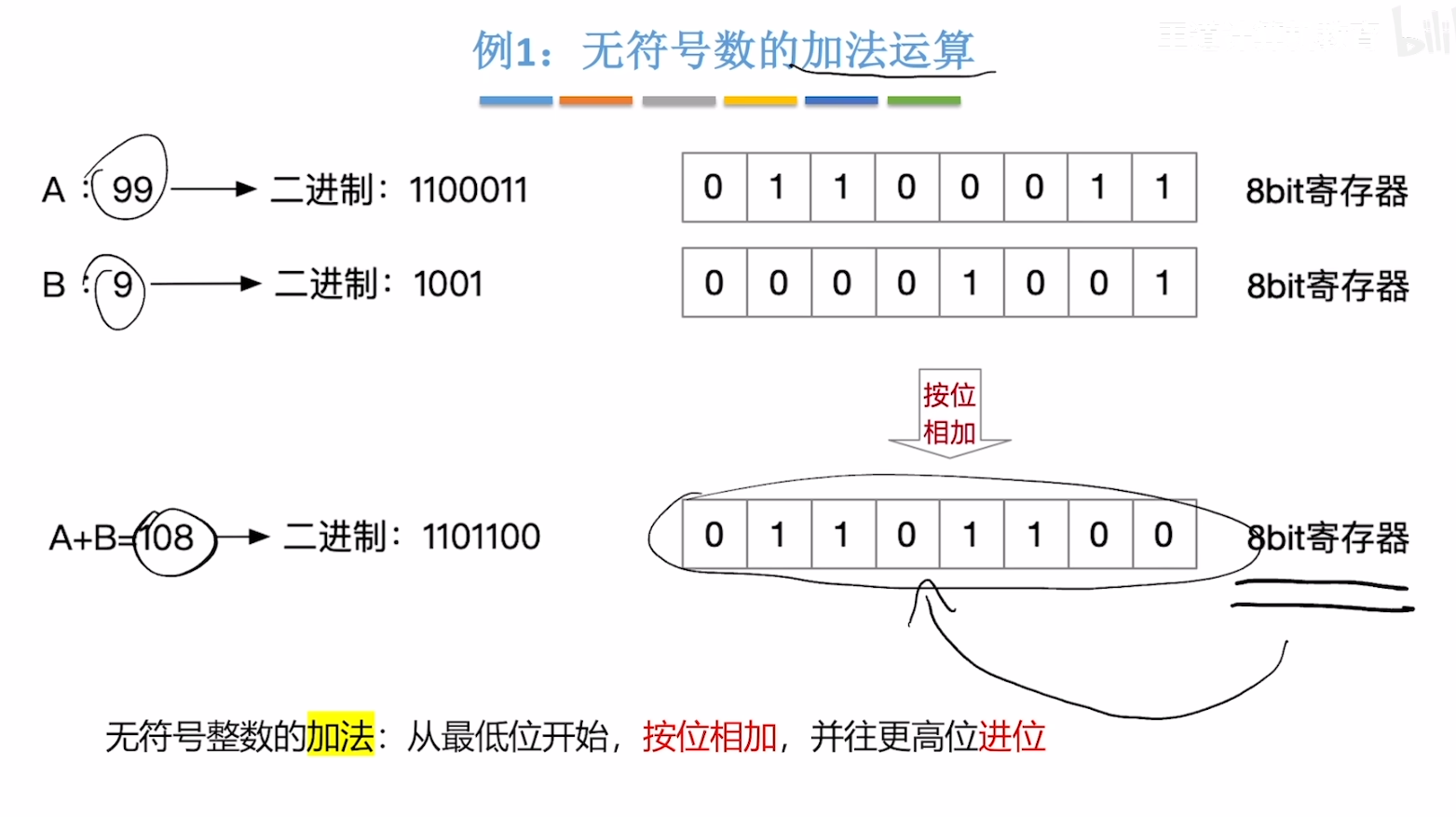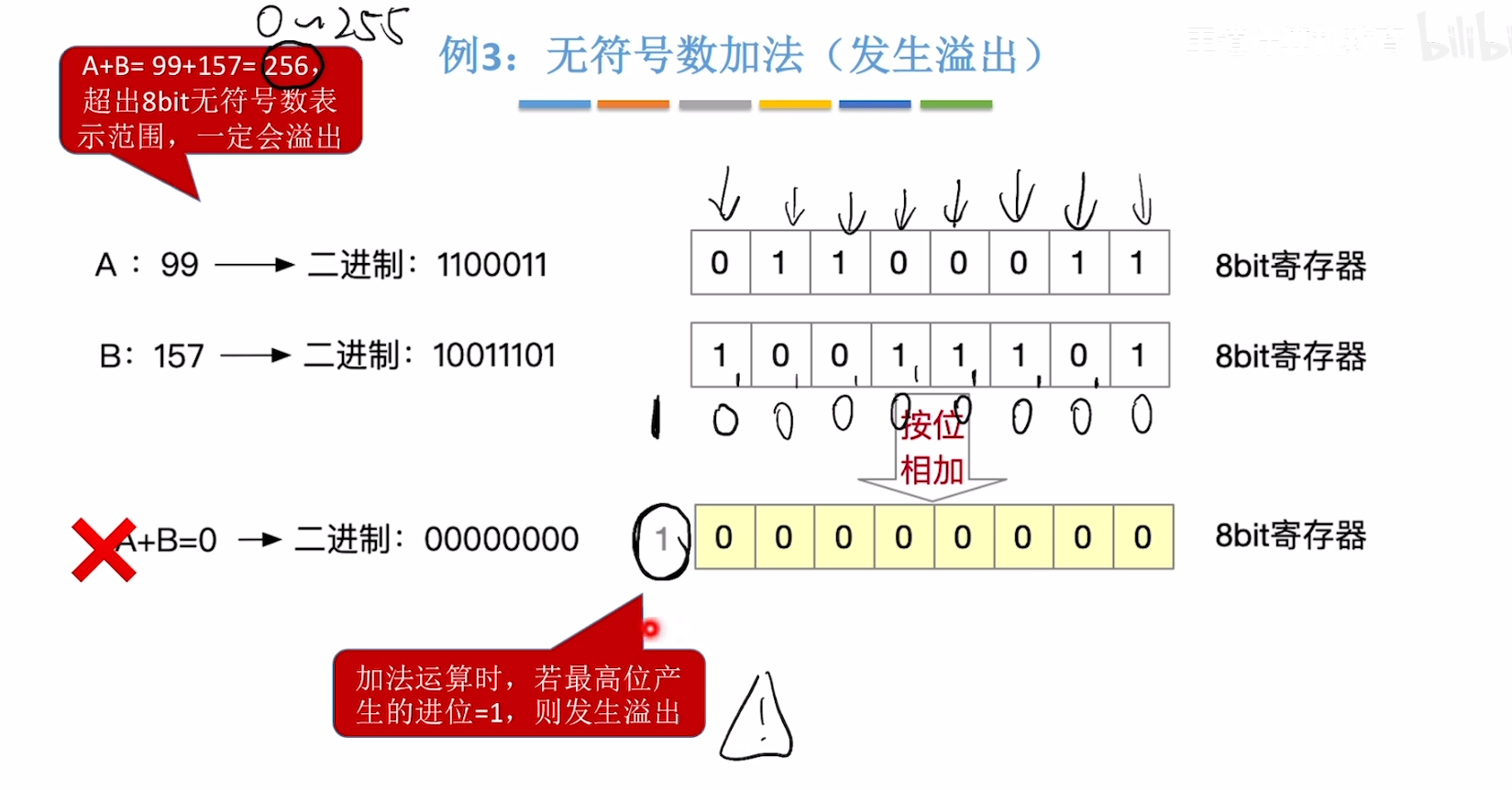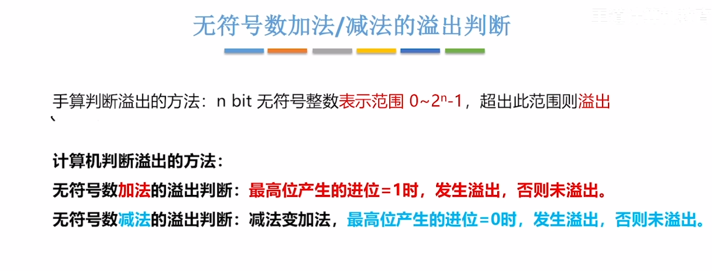 溢出问题,一般使用手算方法,而计算机内部判断无符号数加减是否溢出的方法就如红蓝两行所述