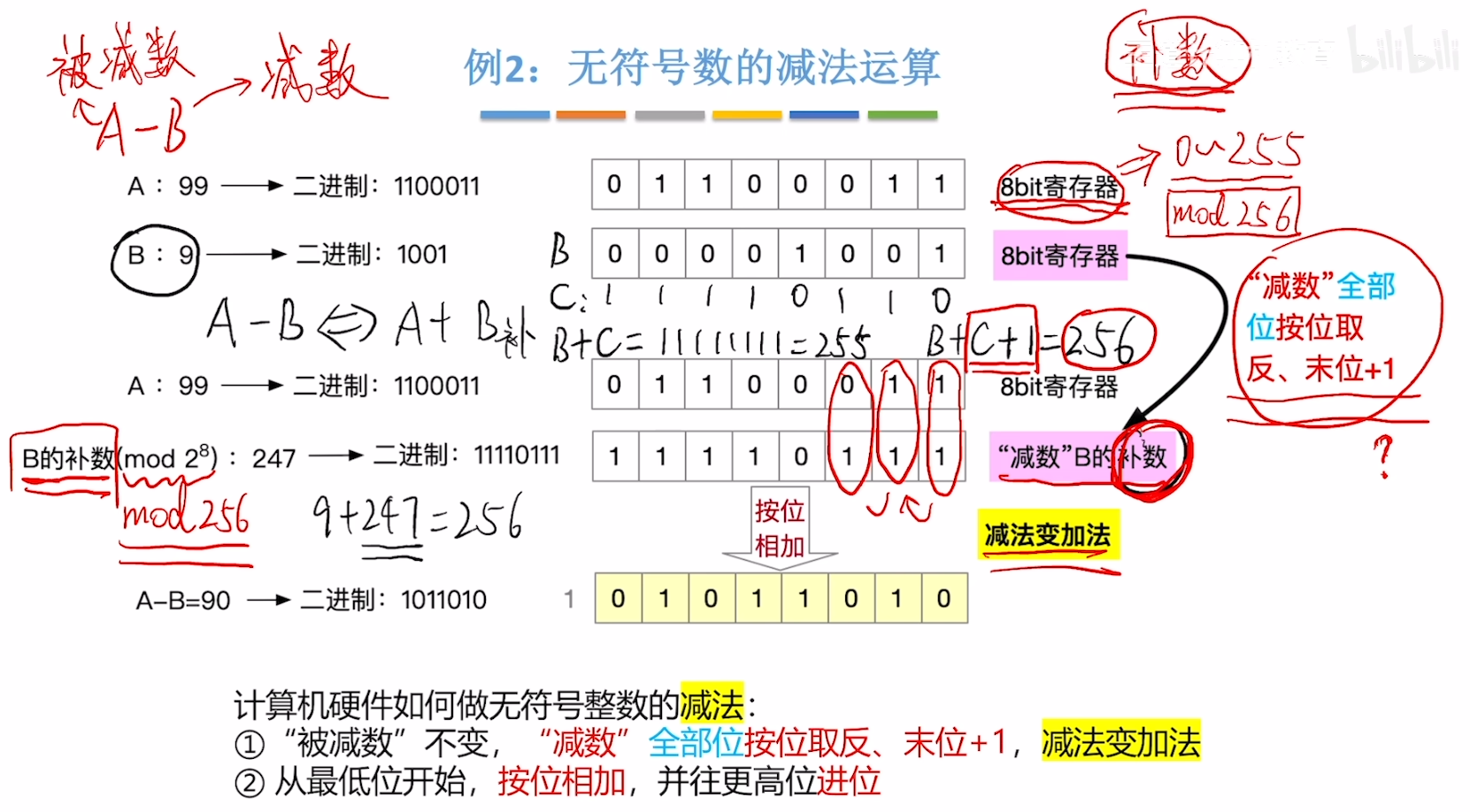 在 8 位寄存器中,数值最多能表示 0 ~ 255,也就是 mod 256,那么假设在该寄存器中存储了一个数A,则