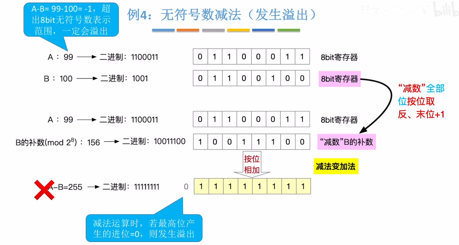 同样的,按减法运算进行计算,若按位相加后,最高位进位为0,则发生溢出