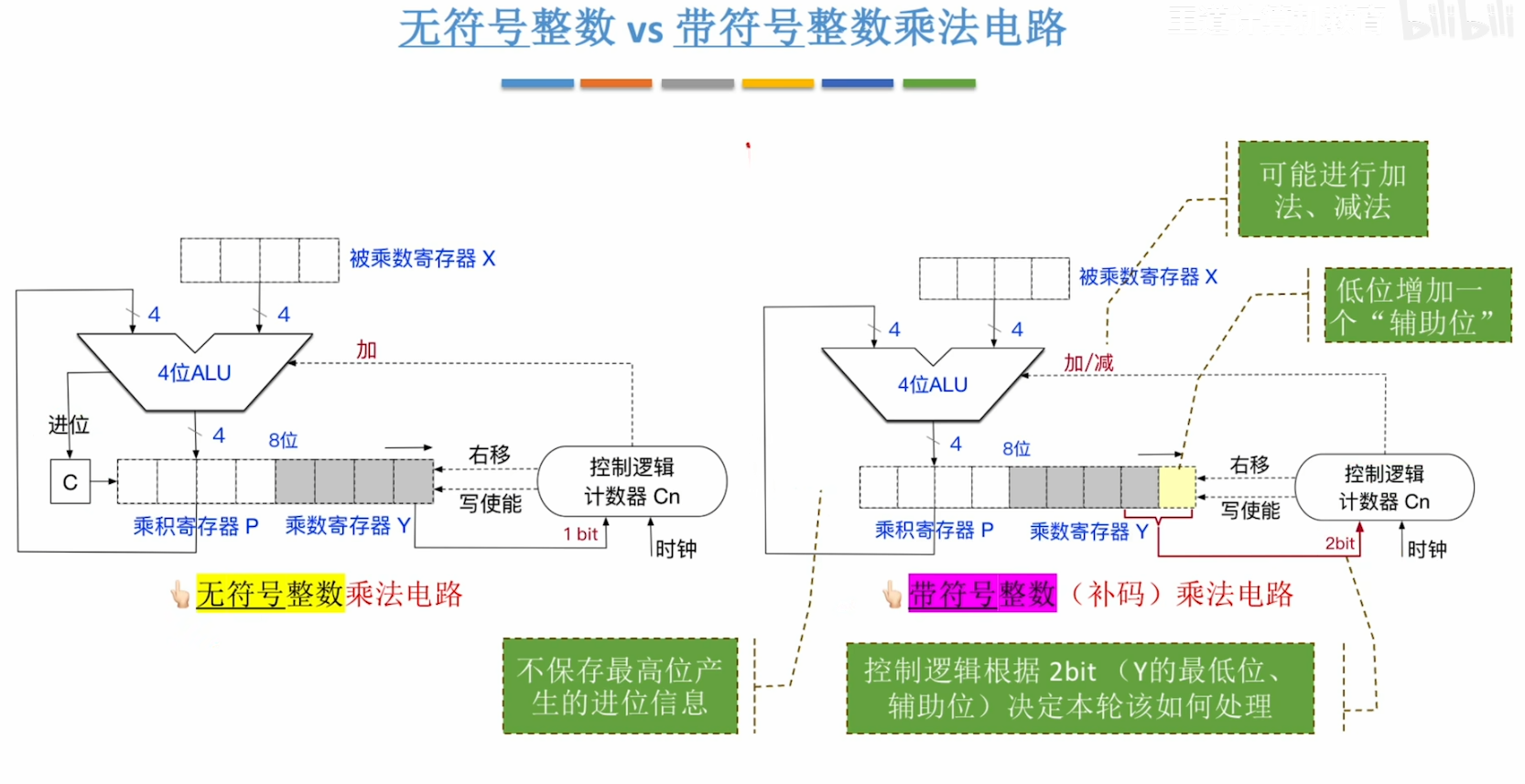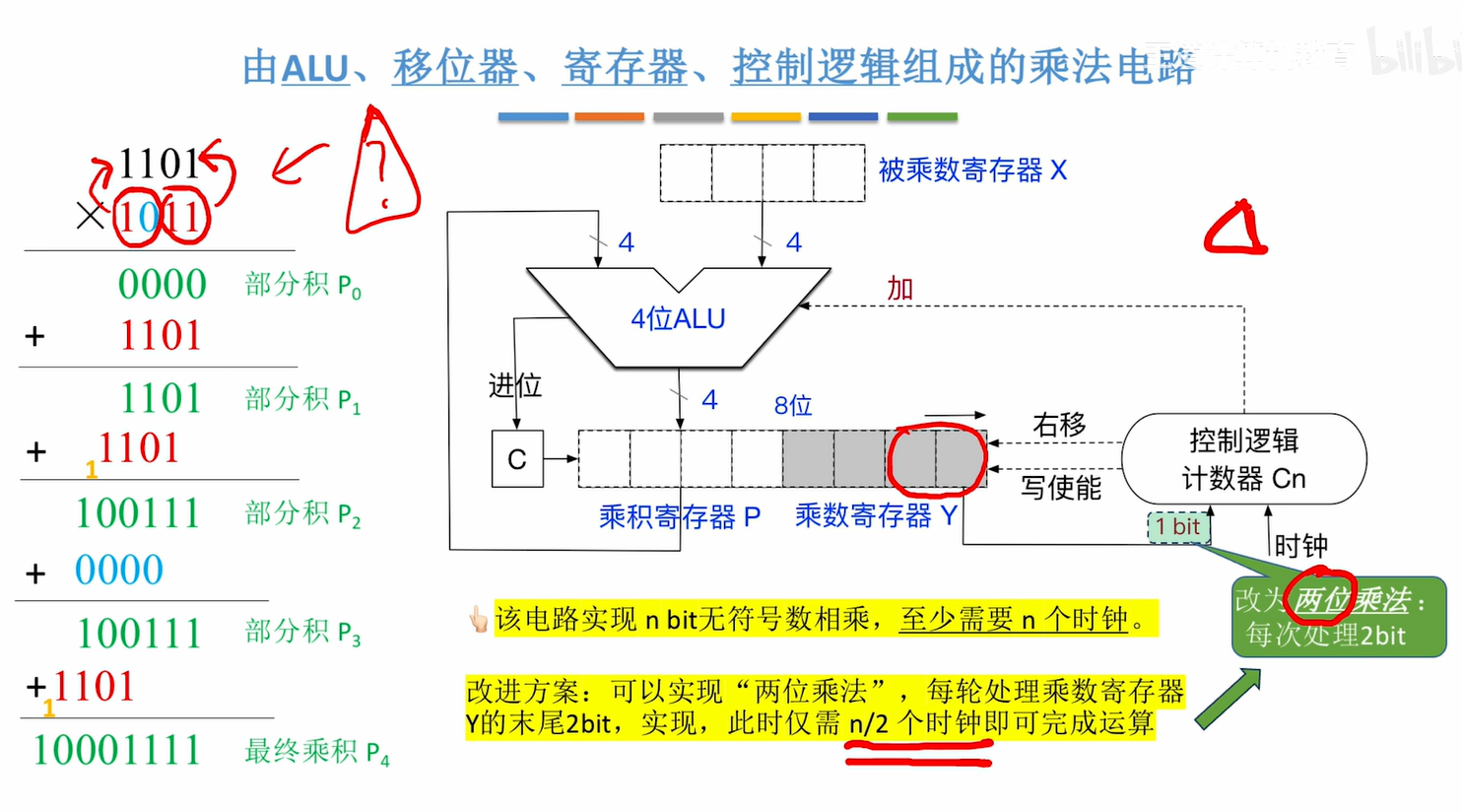 - 由ALU、移位器、寄存器、控制逻辑组成的乘法电路运算速度较快-----通常需要多个时钟(n个时钟:n bit整数的运算)