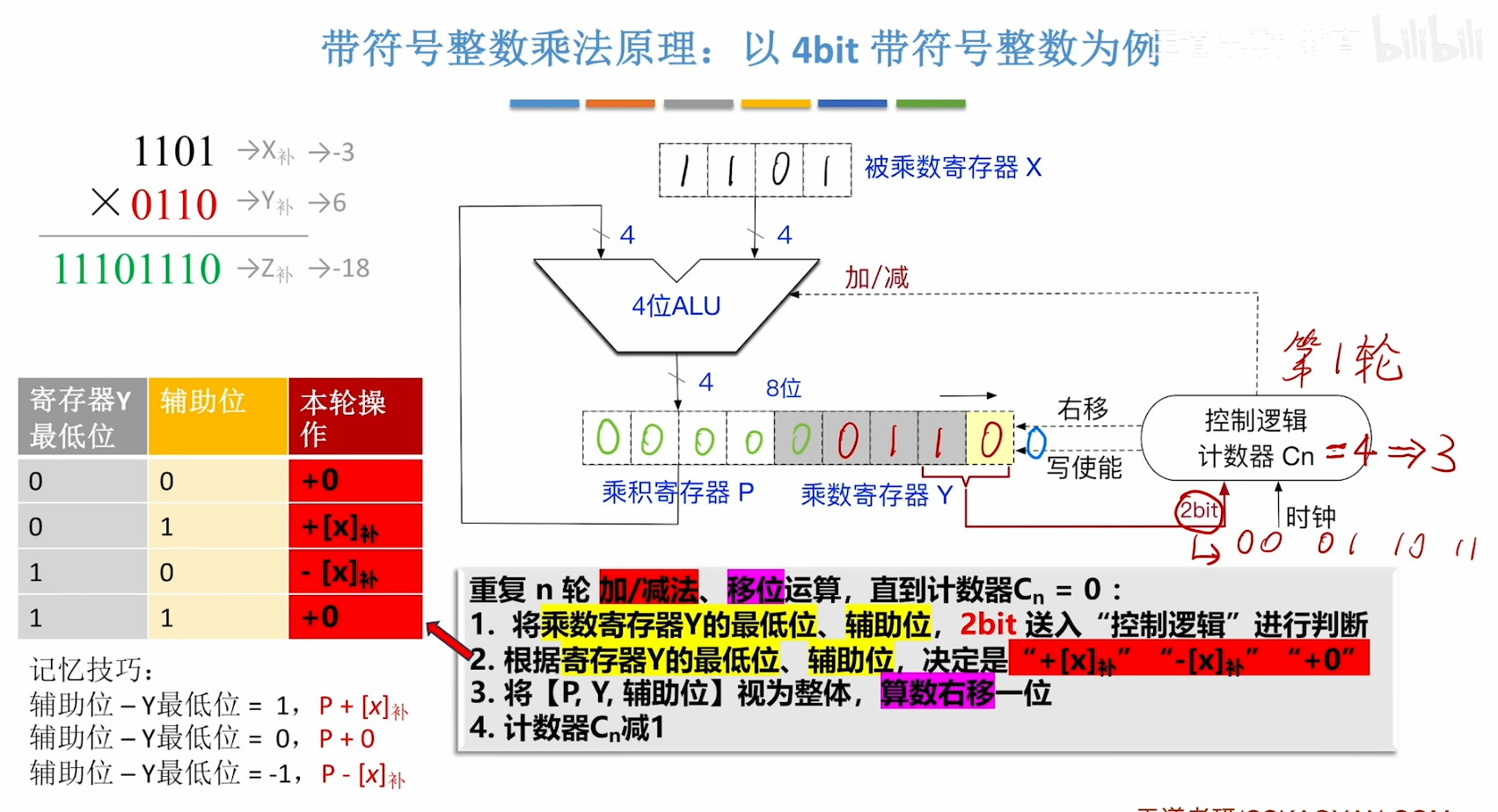 当 + 0 时,可以什么都不做就直接进入下一步 算数右移后,高位以符号位补足 Cn每次取两位(乘数寄存器Y最后一位+辅助位) 因为寄存器内部存储的机器数就是以补码形式存储的,所以要对部分积