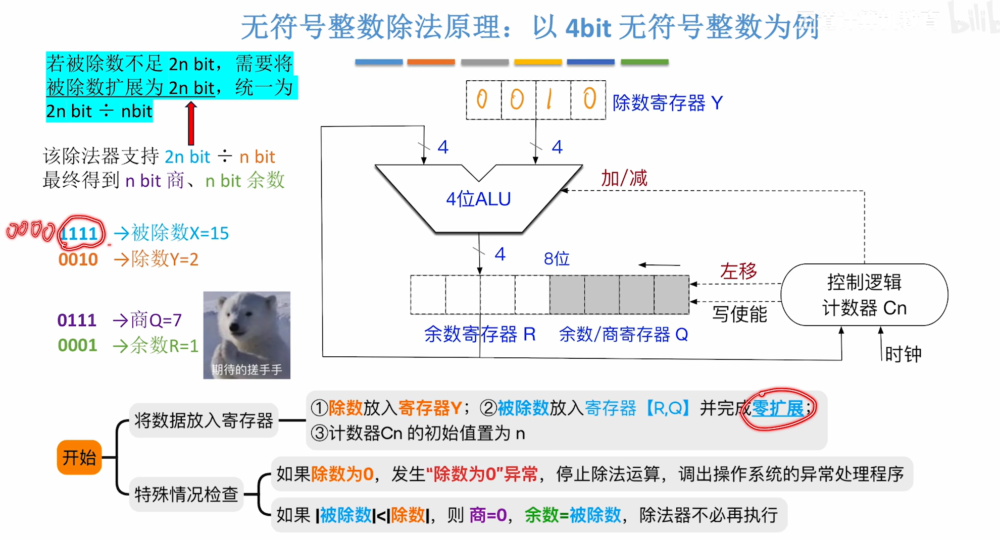 - 将被除数放入寄存器RQ后,若高位不足,则进行零扩展