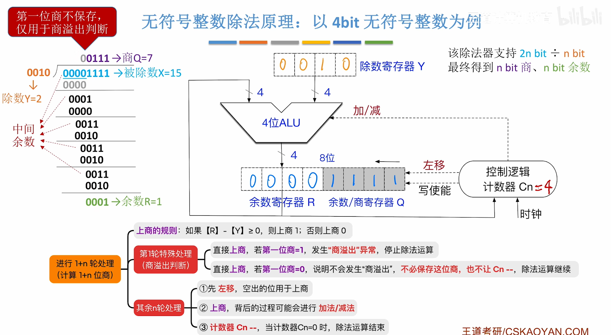 最终得到:n bit 寄存器R 保存余数,n bit 寄存器Q 保存商
