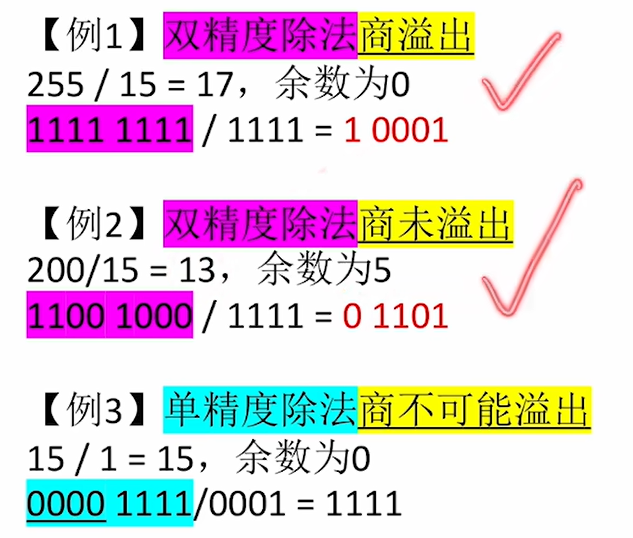 - 2n bit ÷ n bit,商的实际位数可能超过 n bit,因此,无符号整数的双精度除法可能发生“商溢出”(因为最终仅保留 n bit 作为最终结果)