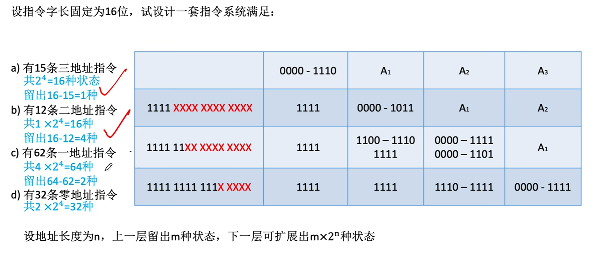 示例: 每个地址码的长度均相等,为4位 地址长度即为地址码长度(该公式不包括第一层的指令状态数),第一层的 n 为操作码的位数,注意区分!!!