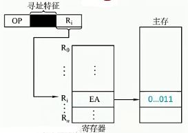 - 与寄存器寻址的区别:寄存器第Ri个存储的内容不是操作数,而是操作数所在主存单元的地址号,即:有效地址EA = (Ri)